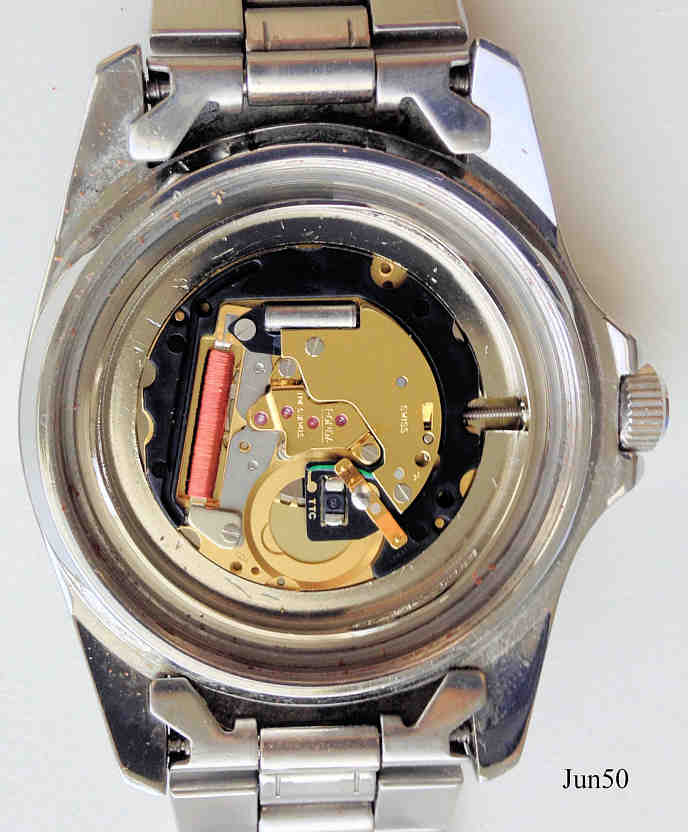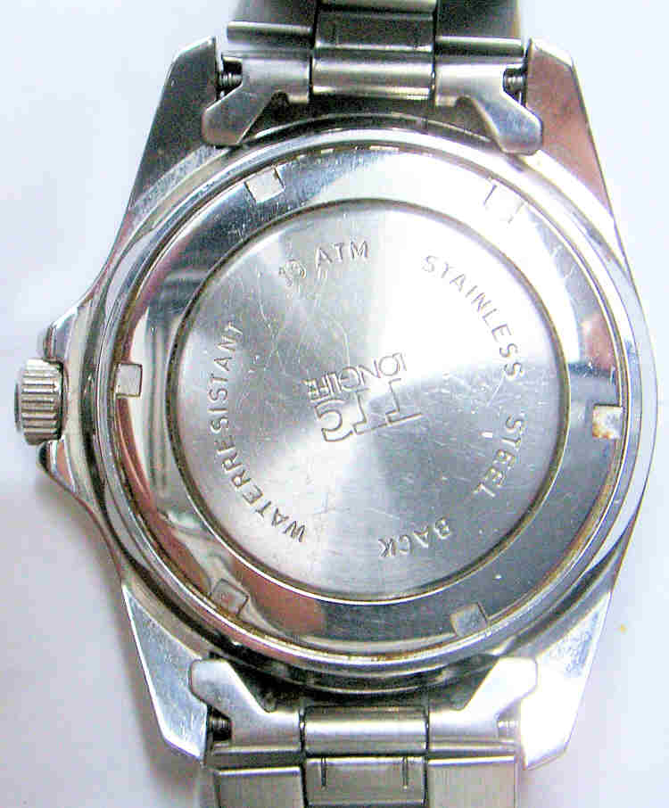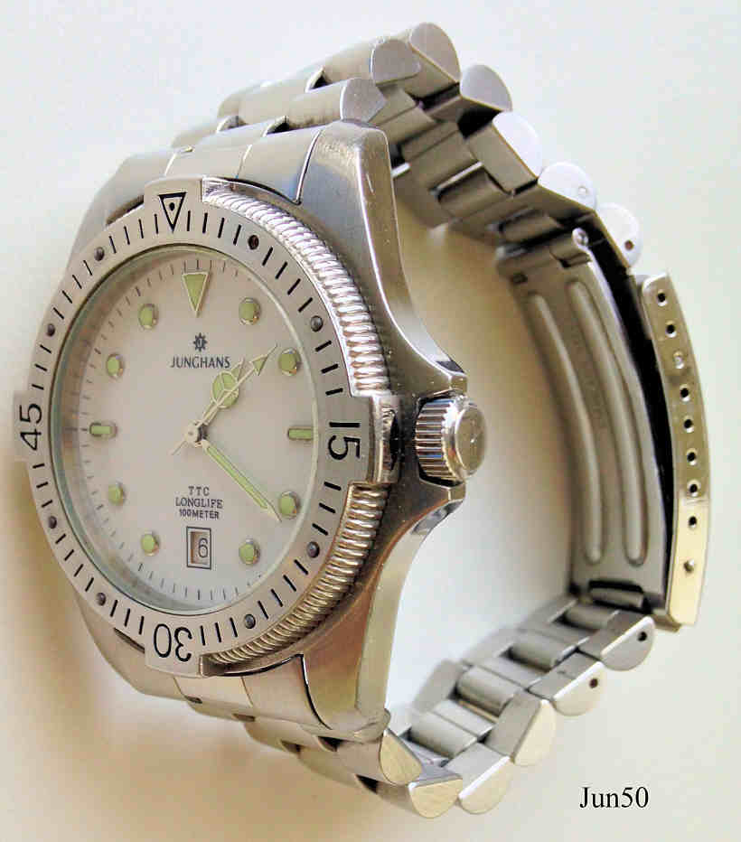 A Junghans TTC Longlife divers watch with a white dial, Date at 6. Signed front: “Junghans, TTC, Longlife, 100M”, back: “TTC, Longlife, Water Resistant, 10 ATM,Stainless Steel Back”, inside: “Swiss, Ronda, Five (5) Jewels, CDA”. The same watch has been issued by ISECO, Junghans then took over, after ISECO went bankrupt. Longlife refers to the battery, the company warrants 20 years of battery life. The whole back is the battery. ISECO did not stand the 20 years and Junghans took over.