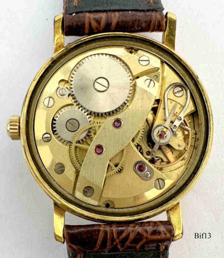 Dies ist eine Bifora Unima Handaufzugs Uhr mit dem Bifora 120 SC Kaliber, wie es auch als Chronometer zertifiziert wurde. Beschriftet vorn: ”BIFORA, Unima, 18 Rubis, Incabloc”, hinten: ”Antichock, Water Protected, Antimagnetic Steel Back”, innen: “B 120”. Kaliber: Bifora 120 SC, Braunes Lederband.