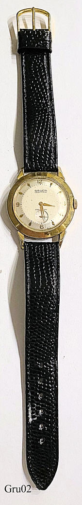 Eine schöne Gruen Uhr mit Handaufzugs Werk. Base Metal Gehäuse in goldfarben mit schwarzem Lederarmband. Schweizer Werk, Kaliber 415, Inschrift vorn: “Gruen, Veri-Thin, Precision”, auf dem Innendeckel: ”Cased and Timed by Gruen Watch Co.,10K A.G.P Bezel, Guildite Back, F71968, 415-966”, auf dem Werk: ”Gruen Watch Co. Swiss, Seventeen 17 Jewels, 415, unadjusted”