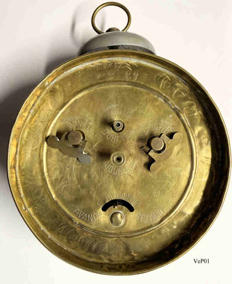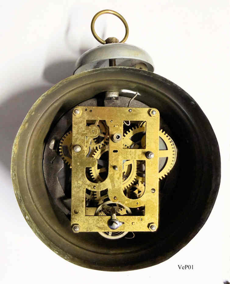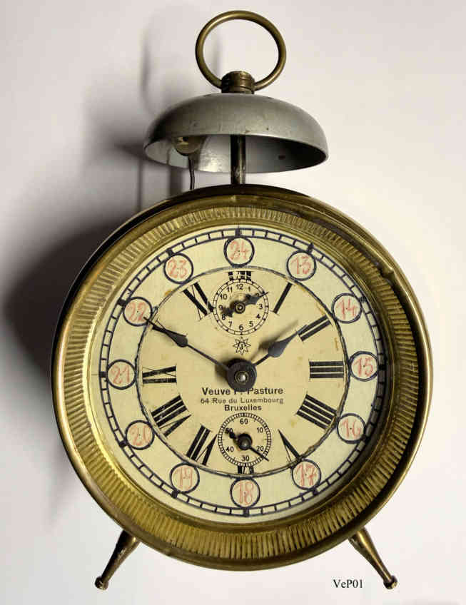 Ein klassischer Wecker aus dem Jahr 1930 von der Belgischen Firma Veuve F. Pasture in.Brüssel auf der Basis eines Junghans Weckers mit dem Werk Junghans B12 .Gehäuse aus Messingblech mit aufgesetzter Glocke. Beschriftet vorn: “Veuve F. Pasture, 64, Rue du Luxembourg, Bruxelles”, hinten: Funktions Beschreibungen in französisch, innen: ”Junghans, B12” |