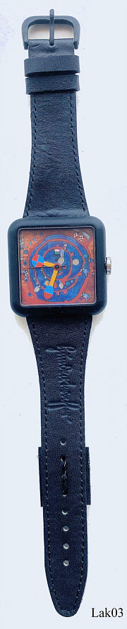 Dies ist die dritte Uhr der Genesis Kollektion von Friedensreich Hundertwasser. Beschriftet vorn: ” ”, hinten: ”Trennt Wasser vom Land. We live in a Paradise- Do not destroy it. Achtung: Zeit gefährdet Dein Leben. Genesis Edition 1887 / 4993, 1995 Hundertwasser, ETA Swiss Movement. Water Resistant. Laks Watch ”, innen: “One 1 Jewel, ETA 902.105, Swiss Parts, Thailand Movement ”, Schwarzes Lederband mit Hundertwasser Schriftzug. Limited Edition 4993 Stück, dies ist Nummer 1887. Wasser ist blau, Erde ist braun. Das ist ein malerisch schöner Kontrast. Es ist wie Mann und Frau, wie Licht und Schatten, die sich nicht wirklich voneinander trennen können und aufeinander angewiesen sind. Obwohl sie getrennt worden sind, sehnt sich das Wasser nach dem Land und das Land nach dem Wasser.