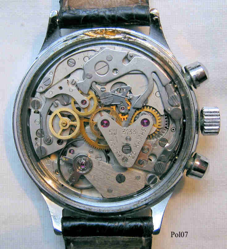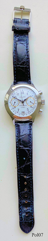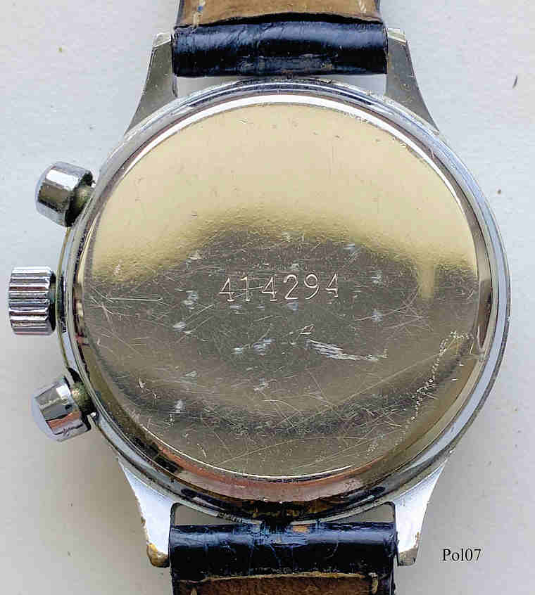 Ein schöner Poljot Chronograph mit Handaufzugs Werk. Edelstahl Gehäuse mit schwarzem, handgenähtem Lederarmband. Gehäuse Nr. 414294, Poljot Werk Kaliber SU 3133, Werk # 43126, 23 Steine, Datum bei der 6. Beschriftet vorn: ”Poljot, Chronograf, 23 Jewels, Made in Russia”, Rückseite: ”414294”, innen: ”SU 3133, 43126, 23 Steine (in Kyrillischer Schrift)”. Schwarzes Lederarmband.