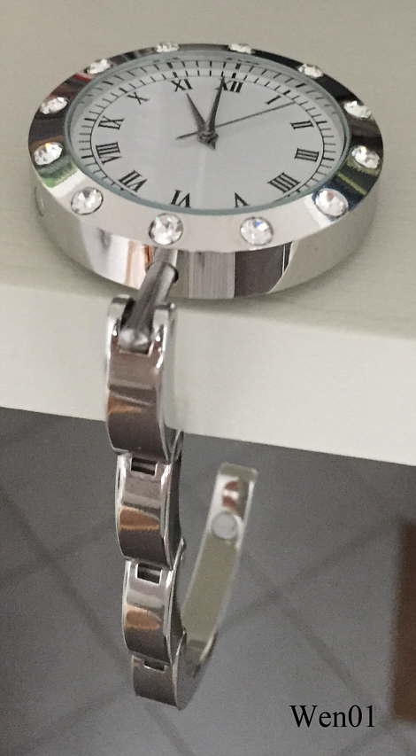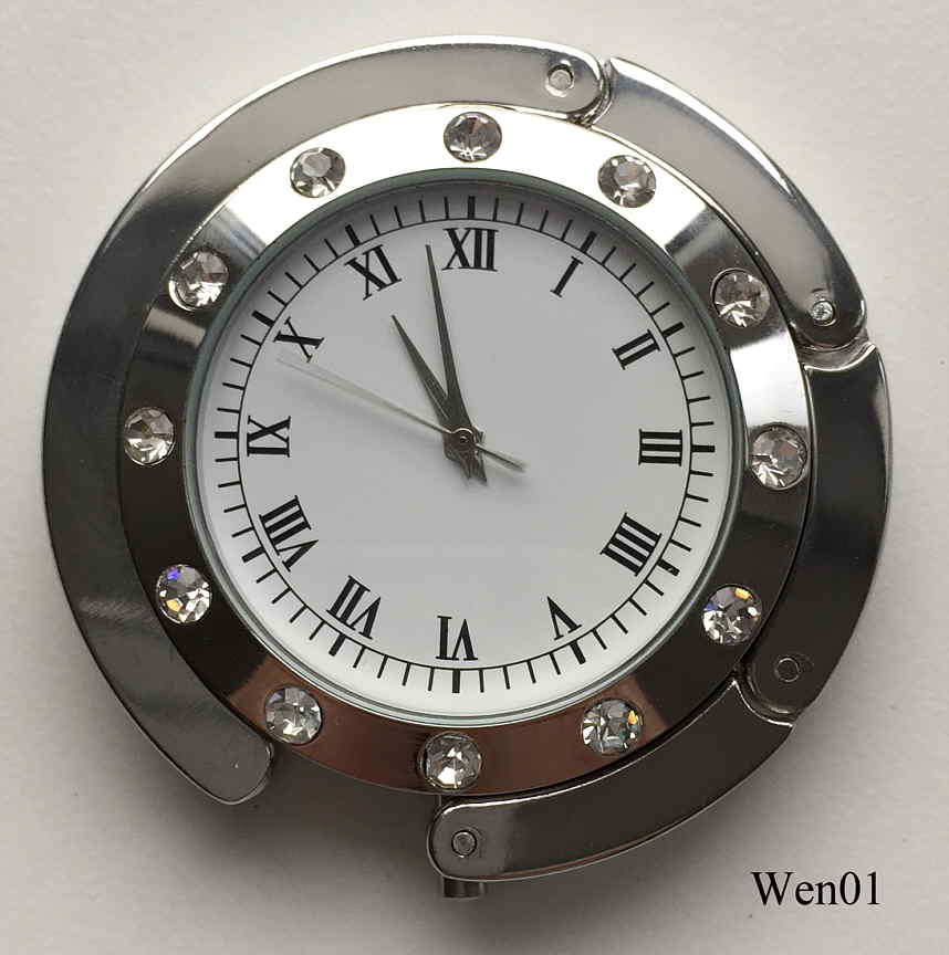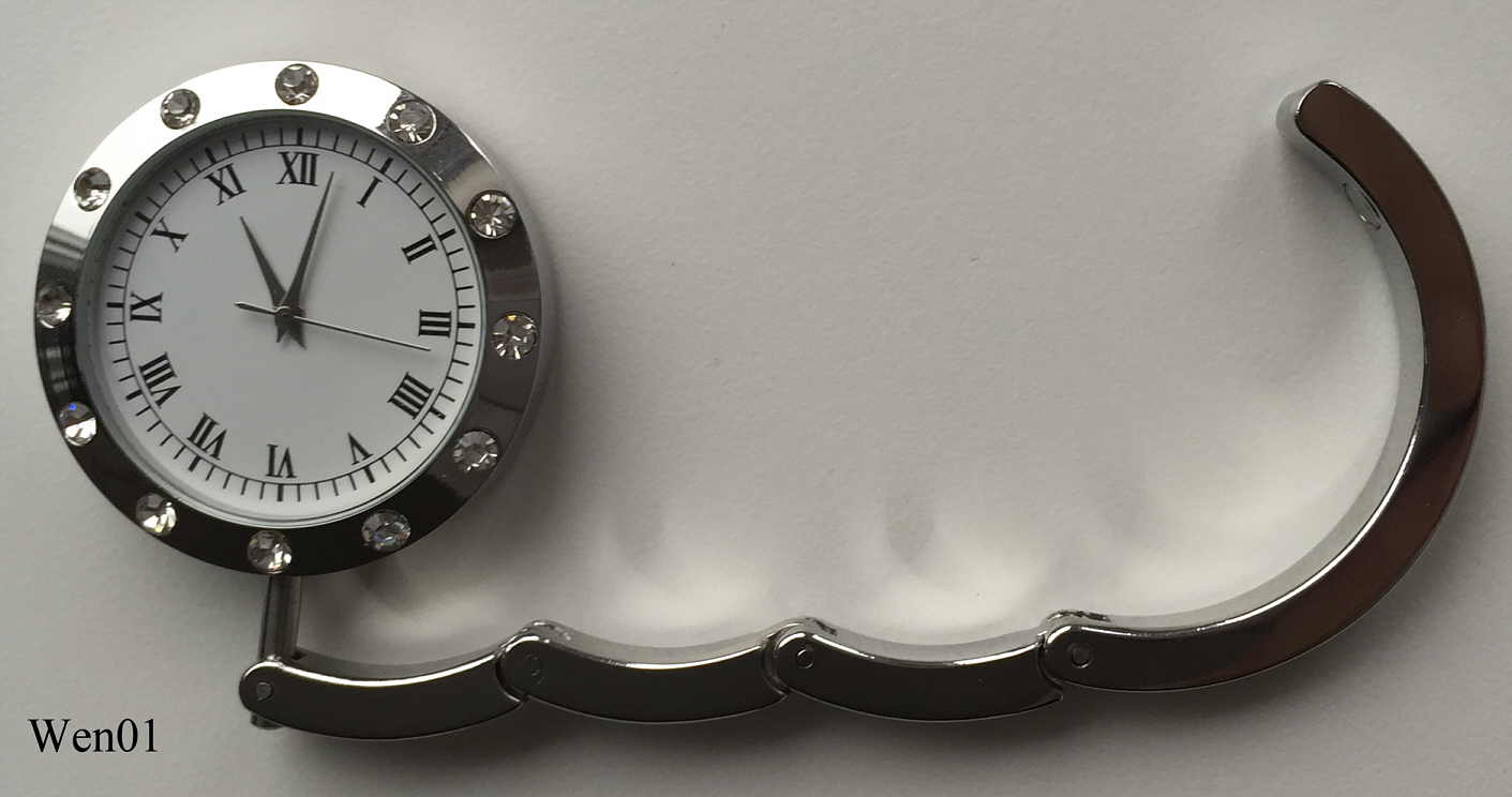 Dies ist eine Schmuckuhr als Handtaschen-Butler. Die Uhr wird im Samtbeutel in der Handtasche getragen, im Restaurant aufgeklappt und an der Tischkante aufgehängt. Dann wird die Handtasche an den Haken gehängt, damit sie nicht an der Erde stehen muß. Beschriftet vorn: ” ”, hinten: ” ”, innen: “No (0) Jewels, Japan, SIIO, EN3D, P021J” Angetrieben von einem SIIO P021J Werk. Keine Markenangabe..