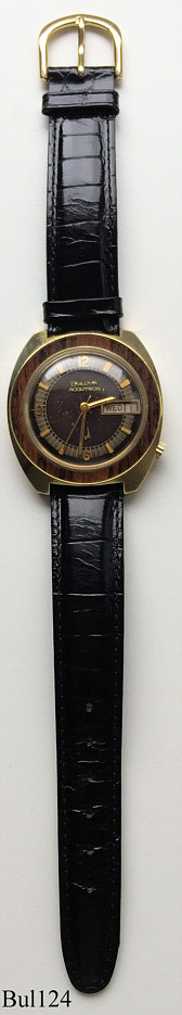 Eine Bulova Accutron mit Base Metal Gehäuse und einem Teakholz Ring um das Zifferblatt, deshalb auch genannt ”Woody”. Beschriftet vorn: “Bulova, Accutron”, hinten: “Bulova, Gold Electroplate Bezel, Water Resistant, 10K Rolled Gold Plate Back, N5, I980787”, innen: “USA, Bulova, 2182”, Case #3275, Caliber 2182, Herstelldatum 1975 (N5), verschraubter Boden, Krone bei der 4, Day/Date in silber bei der 3, braunes Zifferblatt, schwarzes Leder-Armband.
