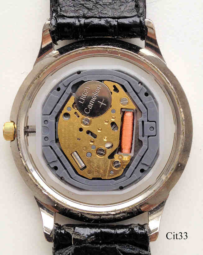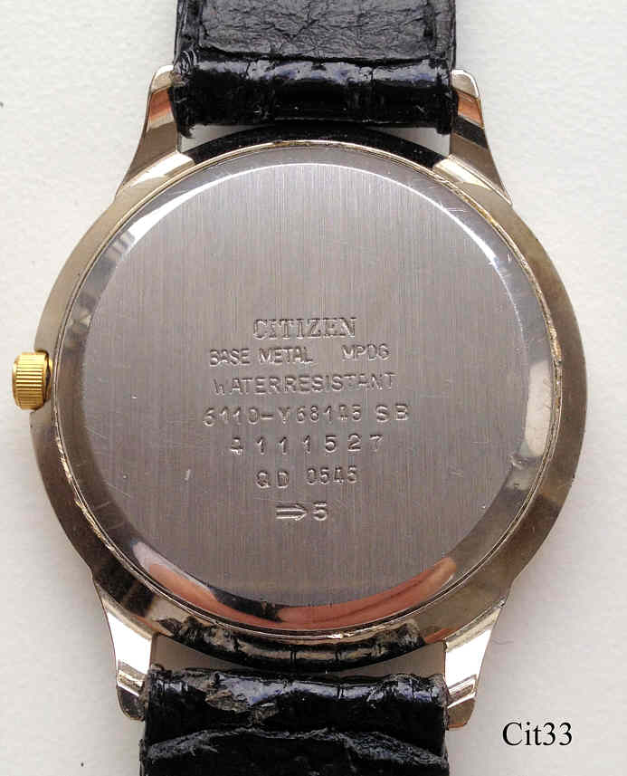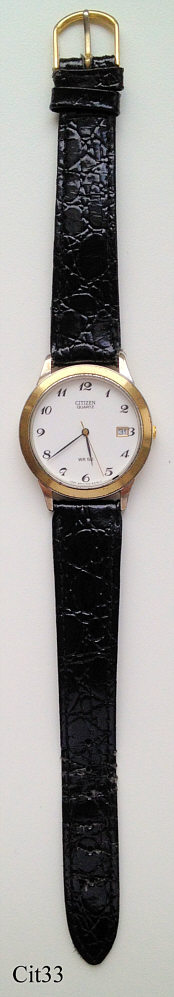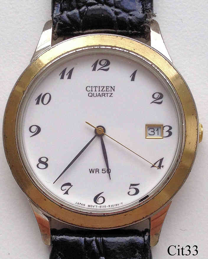 Eine normale Citizen Quartz Uhr mit weißem Zifferblatt und schwarzen Ziffern, Kalender bei der 3. Citizen Caliber 6110, Referenz Nr.: Y68145, Beschriftet vorn: ”CITIZEN, Quartz, WR50”, Innen: ”Citizen, Watch Co, No Jewels, Unadjusted, 6110A, Japan”, Rückseite: ”Citizen, Base Metal MPDG, Water Resistant, 6110-Y68145 SB, 4111527, QD 0545, -> 5”, zweifarbiges Edelstahlgehäuse matt, schwarzes Lederband.