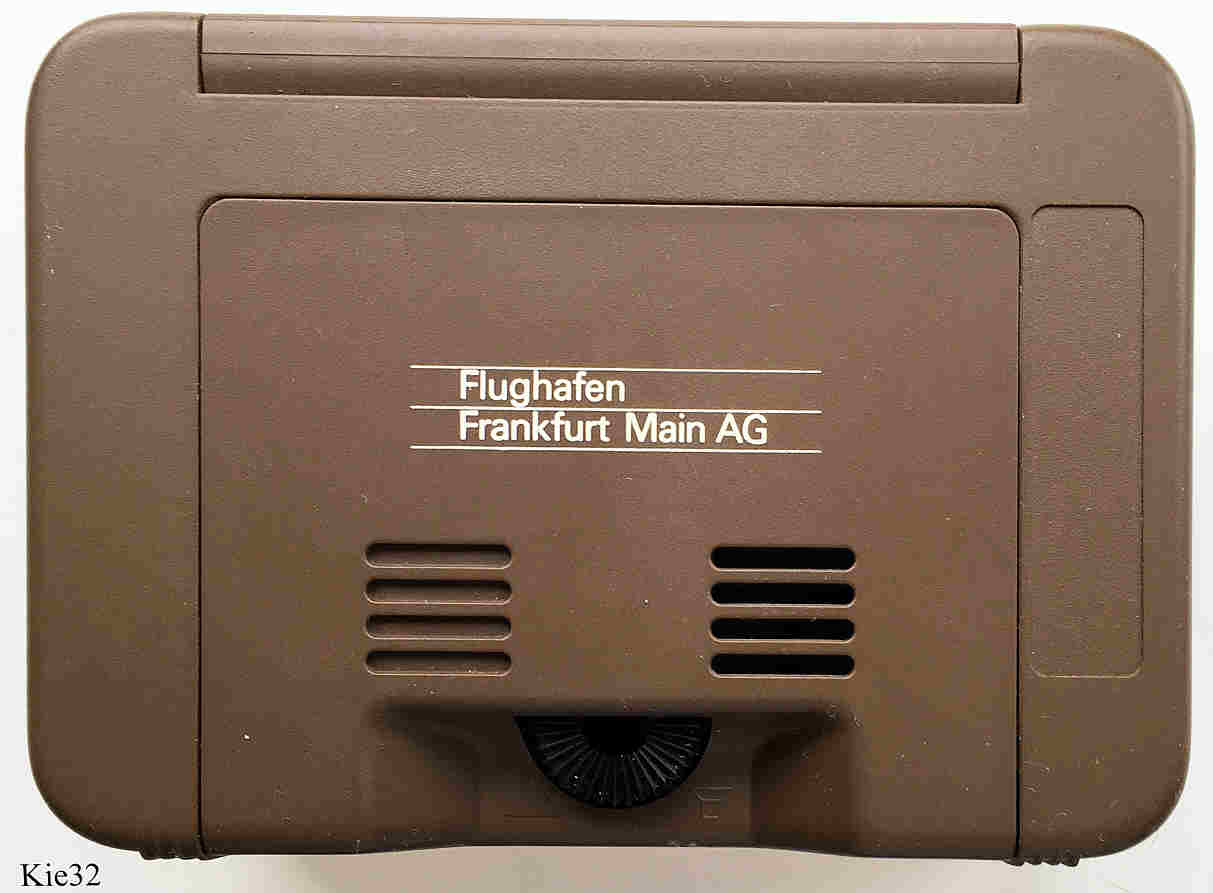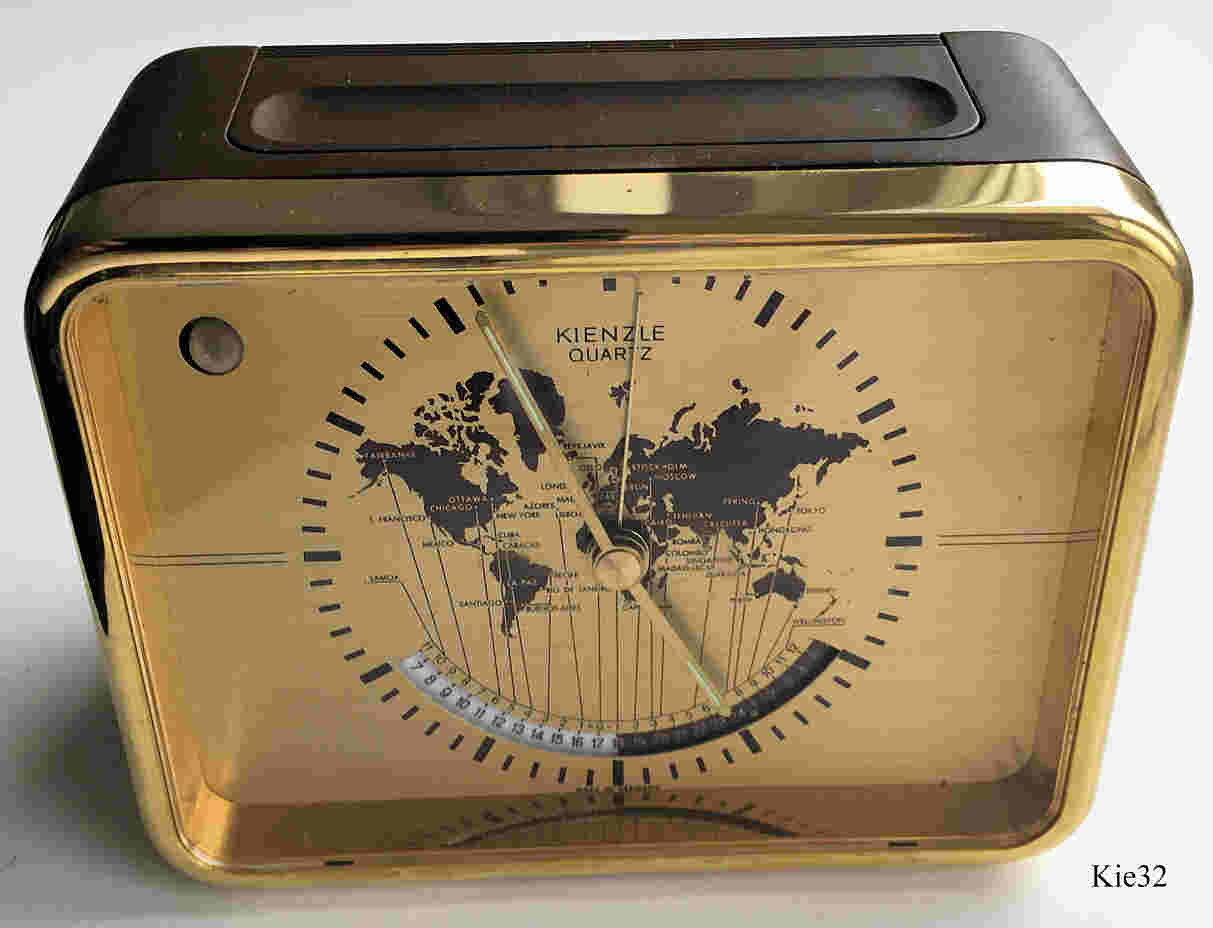 A Kienzle Worldtime Alarm clock as a business gift from Airport Frankfurt Main. Plastic case with gold coloured dial, printed world map with time zones. Between 4 and 8 a time scale, where the actual time of the respective time zone can be read. Signed front: “Kienzle, Quartz”, back: “Flughafen Frankfurt Main AG“.
