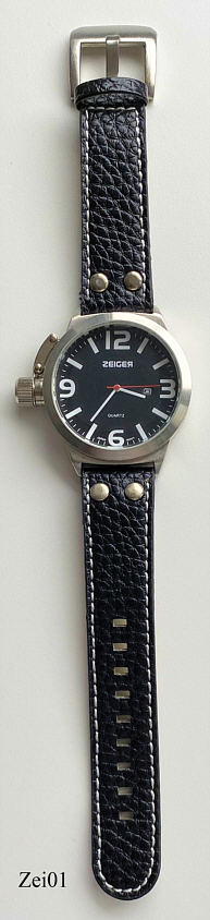 A Zeiger Quartz watch with stainless steel case und Stainless Steel Back, This watch has a screw-on cap over the crown, unusually at 9. Date at 3, signed front: ”Zeiger, Quartz”, back: ”Stainless Steel Back, Japan movt, Zeiger, 8053L”, inside: ”SIIO, PC32A, Unadjusted, No Jewels, Japan”, black Leatherband.