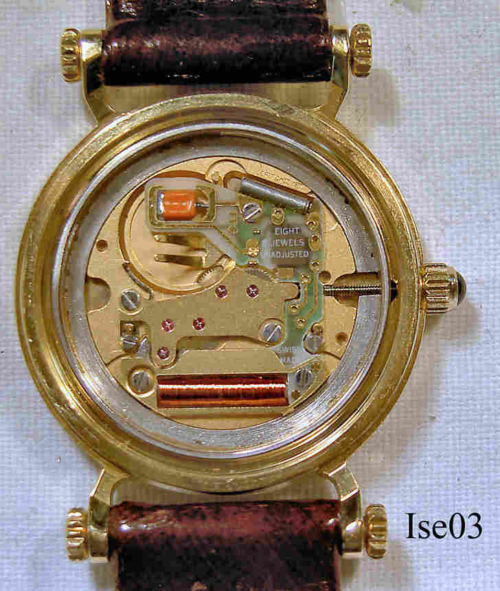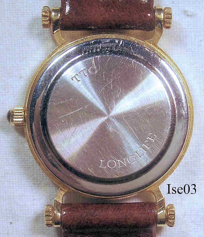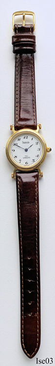 Eine Iseco Damenuhr, passend zur Herrenuhr Ise05. Beschriftet vorn: ”Iseco, TTC, Longlife, Germany”, hinten: “TTC Longlife”, innen: ”Eight 8 Jewels, Swiss, ISATronic 187”. Longlife bezieht sich auf die Lithium Jod Batterie, die die Uhr 20 Jahre Garantiert antreiben soll. Die ganze Rückwand ist die Batterie. Caliber ISATronic187,. braunes Lederband.