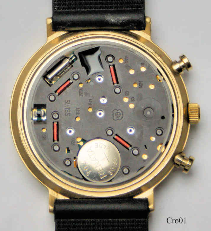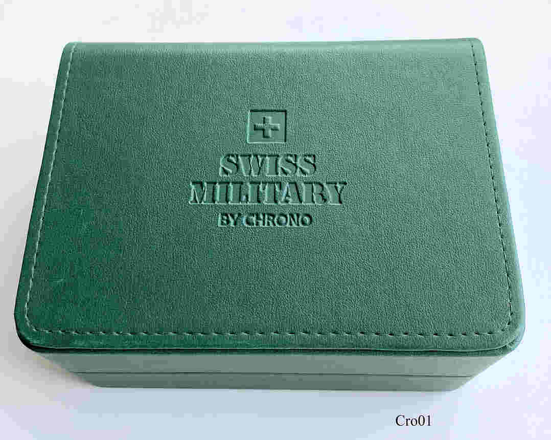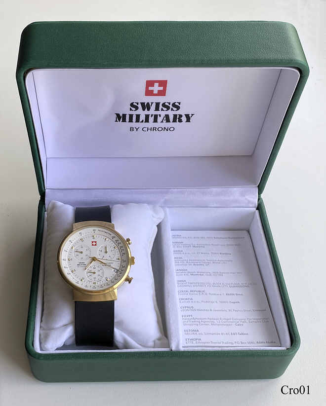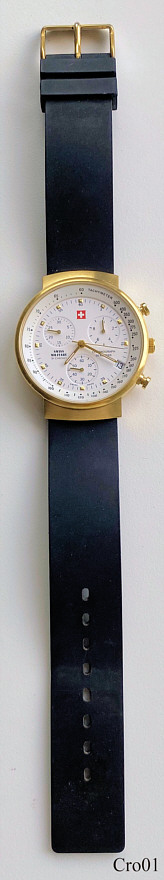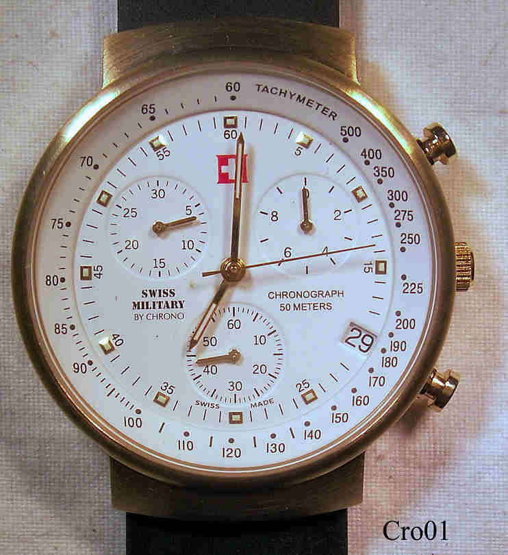 A Chronograph of the Collection of the company Chrono . Signed front: “Swiss, Military, by Chrono, Chronograph, 50 Meters”, back: ”Swiss Military, by Chrono, Chronograph, Stainless Steel Case, Water resistant 50M, Swiss Made, 14700 ”, inside: “ETA G10.21A movement, Date at “4”