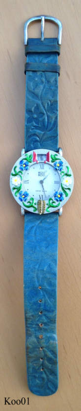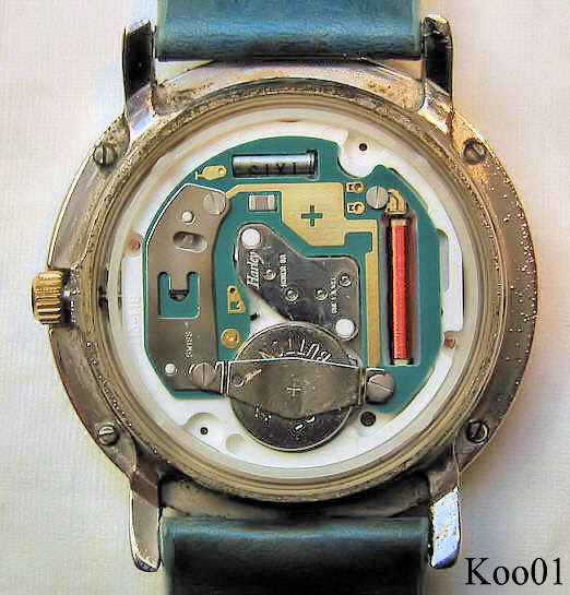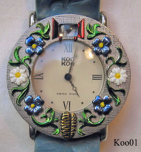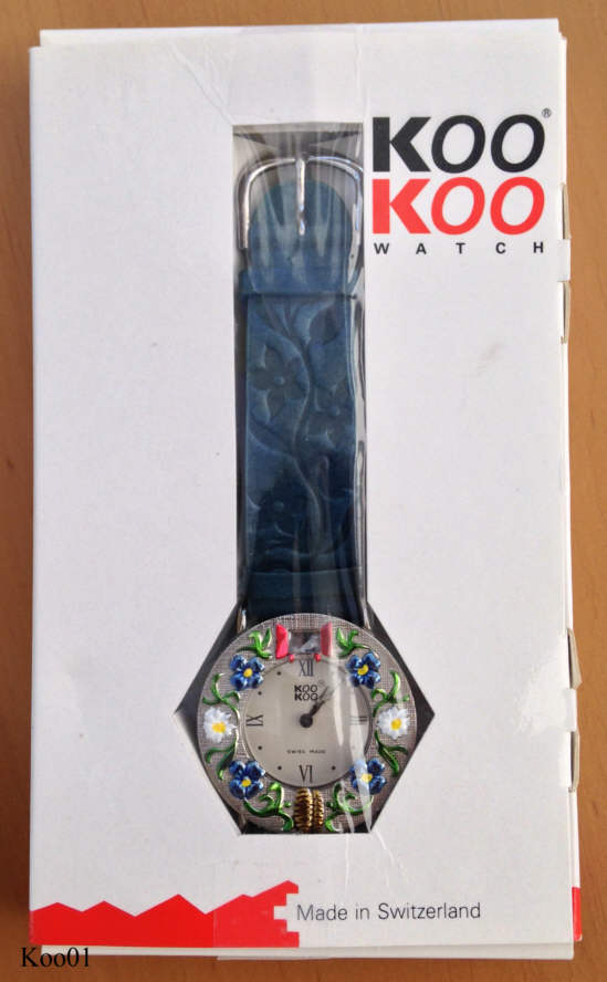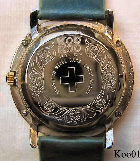 Dies ist eine Schweizer Armband Kuckucksuhr! In dem Fenster über der 12 laufen weiße Vögel im Sekundentakt, einer davon ist rot, um die volle Minute anzuzeigen. Beschriftet vorn: ”KooKoo, Swiss made”, hinten: ”KooKoo Watch, Stainless Steel Back, Swiss Made” Angetrieben von einem Harley Ronda Werk 3873, One 1 Jewel, Grünes Trachten Lederband, Durchmesser 38mm. 1993 vertrieben durch die “No Time AG” der Fossil Group Europe, die passende Damenuhr ist hier.