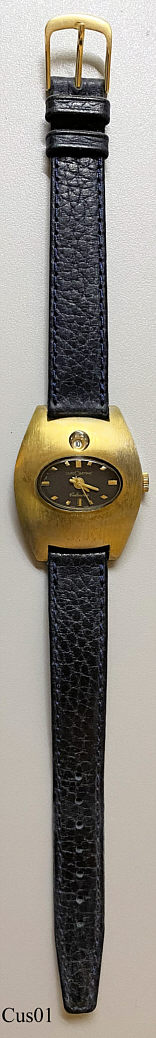 Dies ist eine CustOmtime Schmuckuhr mit vergoldetem Base Metal Gehäuse. Das Zifferblatt ist matt schwarz, das Besondere ist das Bullauge für die Datumsanzeige. Beschriftet vorn: ”CustOmtime, Calendar ”, Rückseite:” Stainless Steel Back, Swiss made”, innen: “Basis Watch, Unadjusted, One Jewel, Swiss”. Schwarzes Lederarmband.