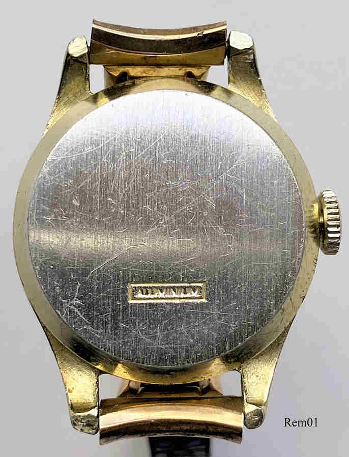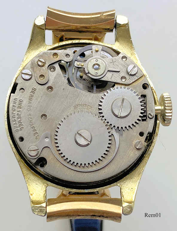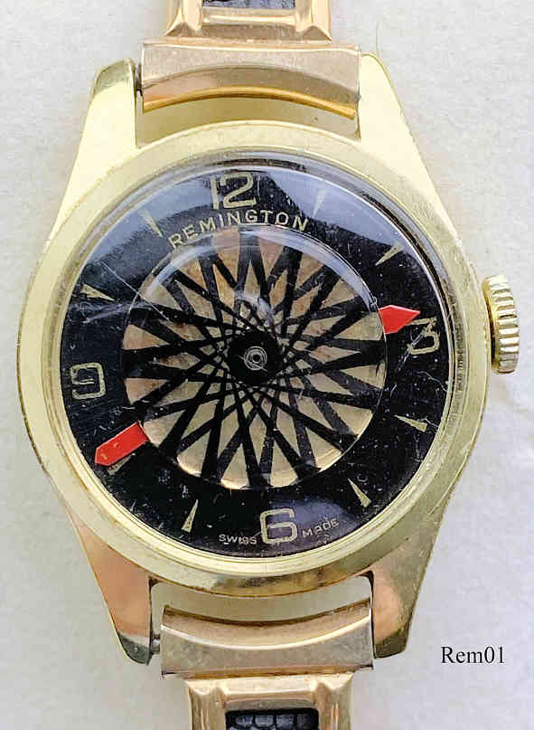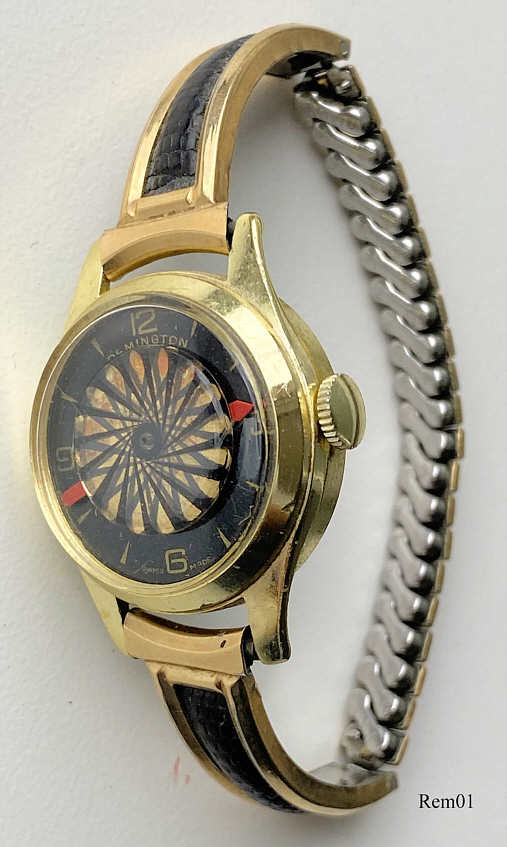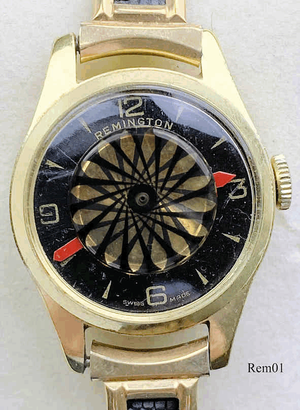 Dies ist eine Remington Handaufzugsuhr mit dem “Mystery” Zifferblatt, bei dem die Sekundenscheibe ein bewegtes Muster erzeugt. Beschriftet vorn: ”Remington, Swiss Made”, innen: ”Bernard Schaffel, one (1) Jewel, unadjusted, SZL, 801”, hinten: ”Aluminium”, spezielles Champion Flexband, halb fest mit Ledereinlage und halb flexibel.