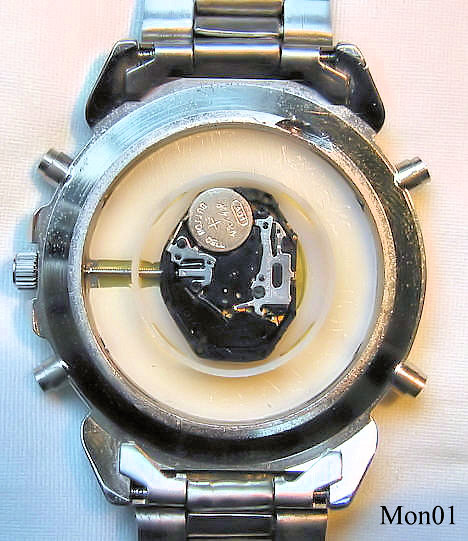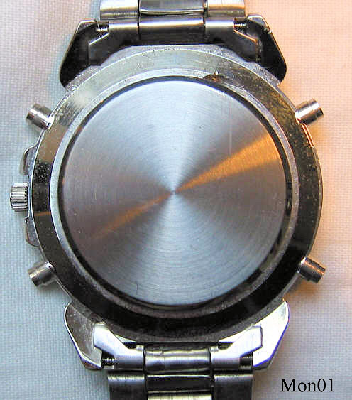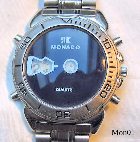 Dies ist eine Monaco Digital Quartzuhr. Sie hat ein normales Quartzwerk, statt der Zeiger drehen sich aber drei Scheiben: Stunden-, Minuten- und Sekundenscheibe. Die Uhrzeit wird dann in einem Fenster abgelesen. Hier wurde ein massives Chronographen Gehäuse verwendet, um der Uhr einen sportlichen Look zu geben, die Drücker sind ohne Funktion. Beschriftet:” Monaco, Quartz”. Keine Jump hour, daher ist die Stunde schrwer zu erkennen |