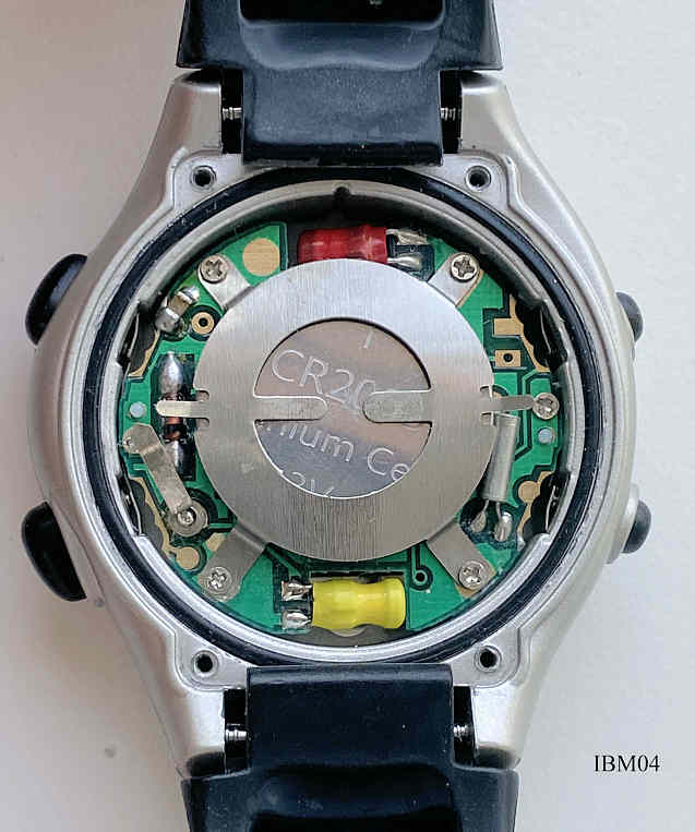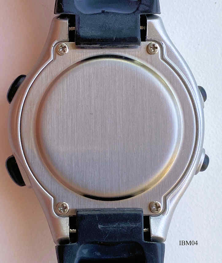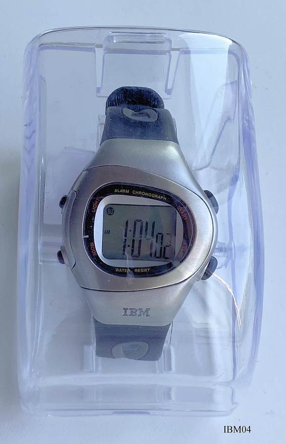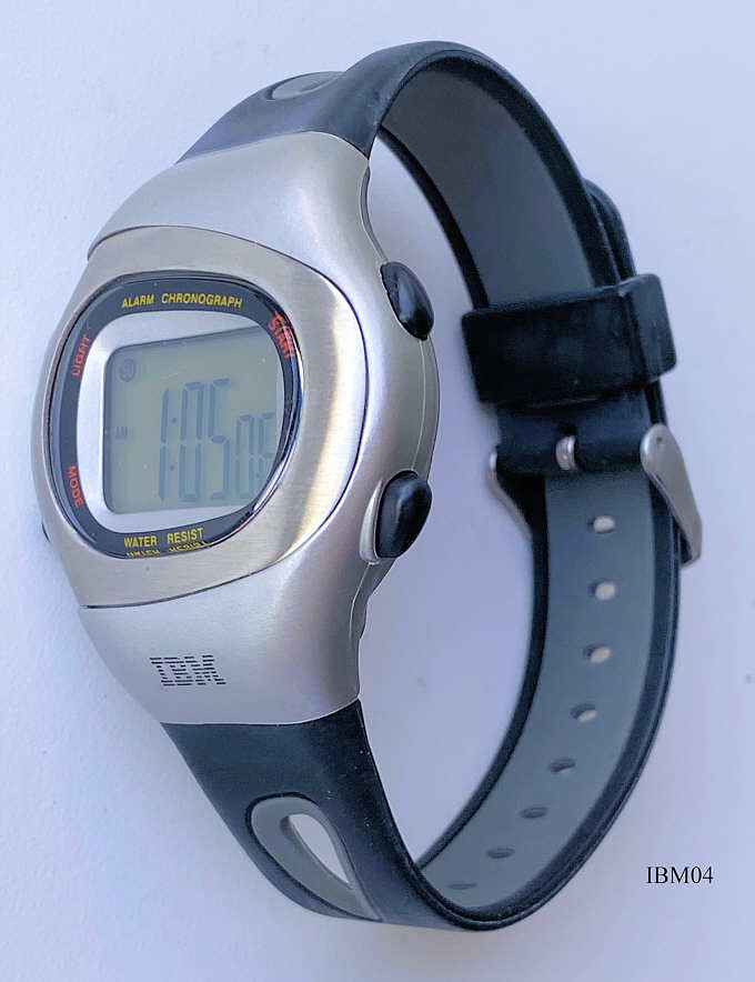 Eine Werbeuhr aus der Kollektion der Firma IBM in Deutschland. Auf dem Gehäuse befindet sich das IBM Logo. Es handelt sich hier um einen LCD Chronographen mit etlichen Funktionen wie z.B. Wecker und Stoppuhr. Beschriftet vorn: ”Alarm Chronograph, Water Resist”, Schwarzes Lederarmband