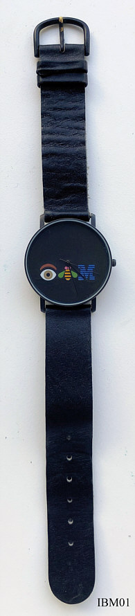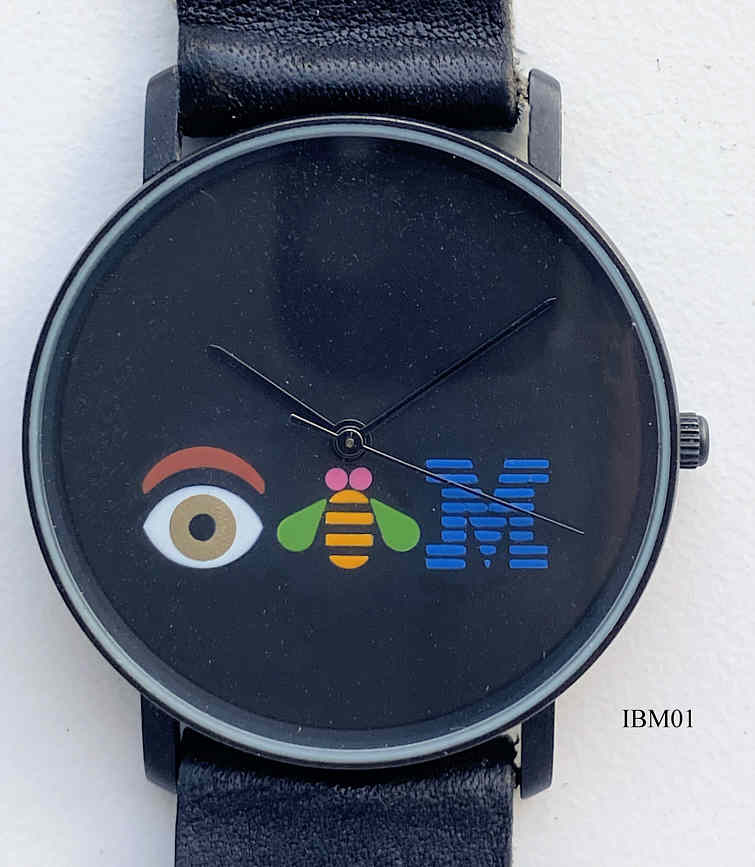 Eine Werbeuhr aus der EyeBeeM Kollektion der Firma IBM in Deutschland. Die Uhr trägt das EyeBeeM Logo von Paul Rand, was zur ständigen Sammlung des MoMA in New York gehört. Das Auge steht für Visionen und Ziele, Die Biene steht für Engagement und Beharrlichkeit mit denen wir die Ziele verfolgen und das M steht für die Menschlichkeit, die wir zeigen sollten. Beschriftet vorn: “IBM”, hinten: ”Design Klaus Botta für Bestform, Wasserdicht 3 ATM, Swiss Made”, innen: “Swiss, Seven (7) Jewels V8, ETA 955.412”