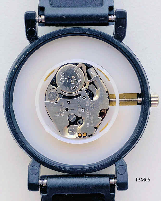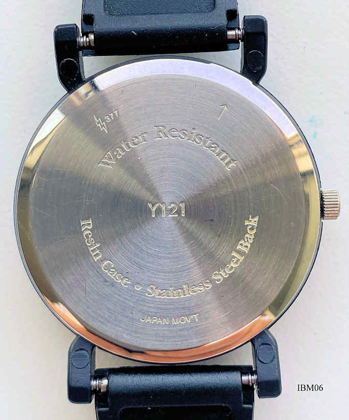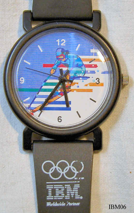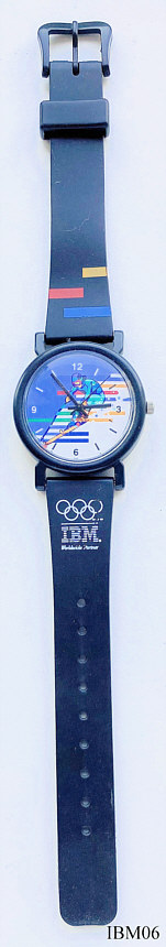 Eine Werbeuhr aus der Kollektion der Firma IBM in Deutschland zur Erinnerung an die Winterolympiade in Nagano, bei der IBM die Datenverarbeitung organisiert und durchgeführt hat. Vorn befindet sich das Nagano Logo, hinten steht ”Water Resistant, Resin Case, Stainless Steel Back, Japan Movt. Y121”, innen: “TMI; Japan, Time Module Inc., No Jewels, Y121E”. Blaues Plastik Armband