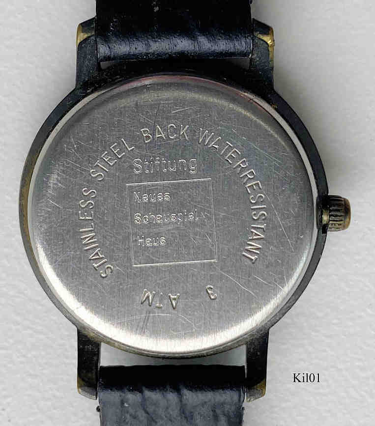 Mit dem Verkauf dieser Uhr über die Kieler Spar- und Leihkasse wurde Geld für das Neue Schauspielhaus Kiel gesammelt. Das Zifferblatt ist aus dem alten Kupferdach des Kieler Rathauses hergestellt. Beschriftet vorn: ”SK, Profil des Kieler Rathauses”, hinten: ”Stainless Steel Back, Water Resistant 3 ATM, Stiftung Neues Schauspielhaus”, innen: “Ronda, OCD, Swiss Parts Thailand Assembly, 1 one Jewel” .