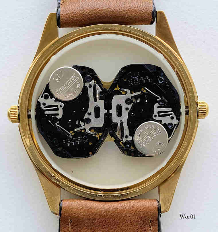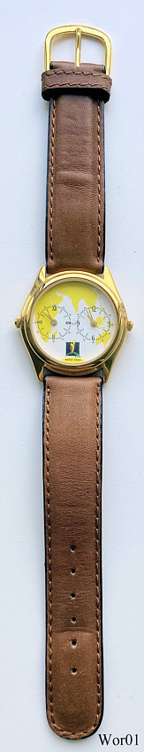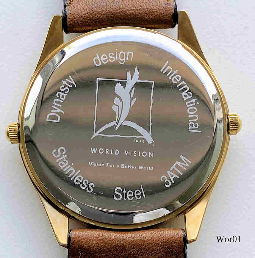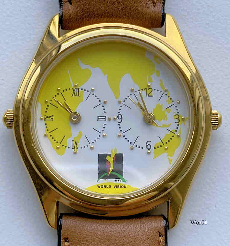 Eine Werbeuhr von World Vision. Tatsächlich sind es zwei von einander unabhängige Quartz Uhren in einem Gehäuse, damit hat man zwei völlig unabhängige Zeitzonen in einer Uhr. Beschriftet vorne: “World Vision”,hinten: ”Dynasty Design International, Stainless Steel 3 ATM, World Vision, Vision for a better World”, innen: “Time Module Inc., PC21A, No Jewels, Unadjusted, Japan”. Zwei Werke TMI PC21A.