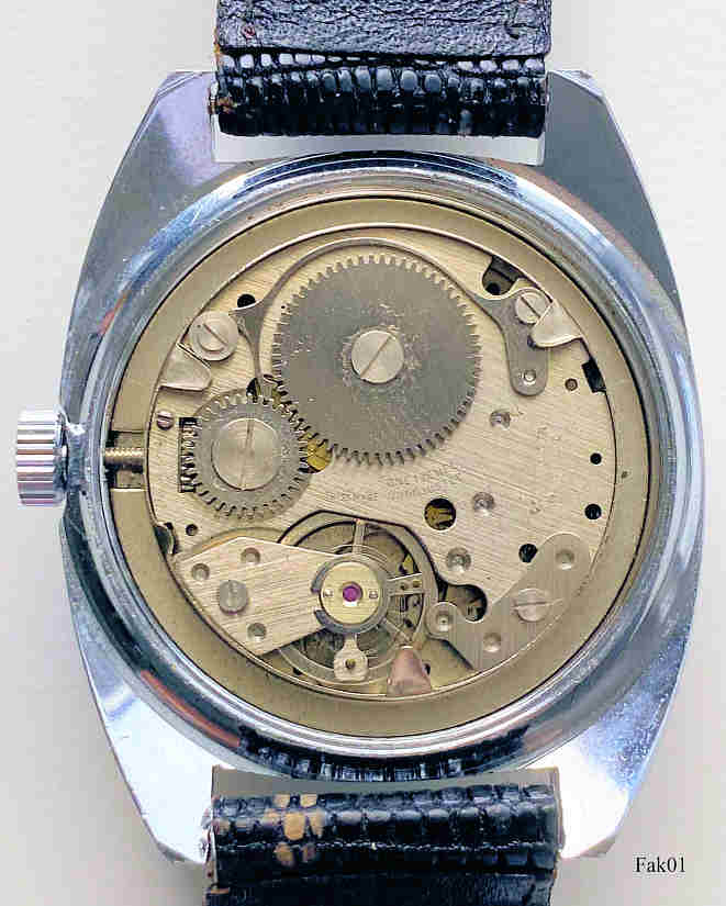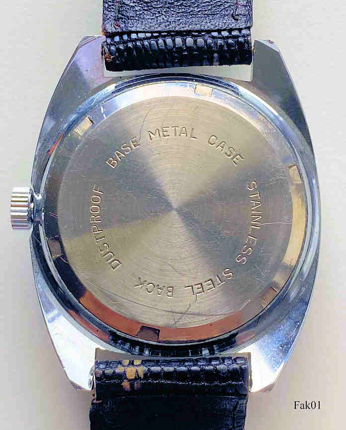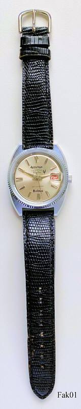 Dies ist der recht ungeschickte Versuch eine Bulova Accutron Stimmgabeluhr zu imitieren. Erstaunlich, da hier ein elektronisches Werk durch ein billiges mechanisches Werk ersetzt wurde, wo doch sonst eher aufwendige mechanische Werke durch einfache Quartz Werke nachgebildet werden. Diese Uhr hat selbst äusserlich wenig Ähnlickeit mit einer Bulova Accutron, sogar das Stimmgabel Symbol ist ziemlich misslungen. Beschriftet vorn: “Accutron, Calendar, Electra, Sportsman, Bulova”, innen: “One 1 Jewel, Swiss Made, Unadjusted, Constructa Watch Ltd.”, hinten: “Stainless Steel back, Dust Proof, Base Metal Bezel”.