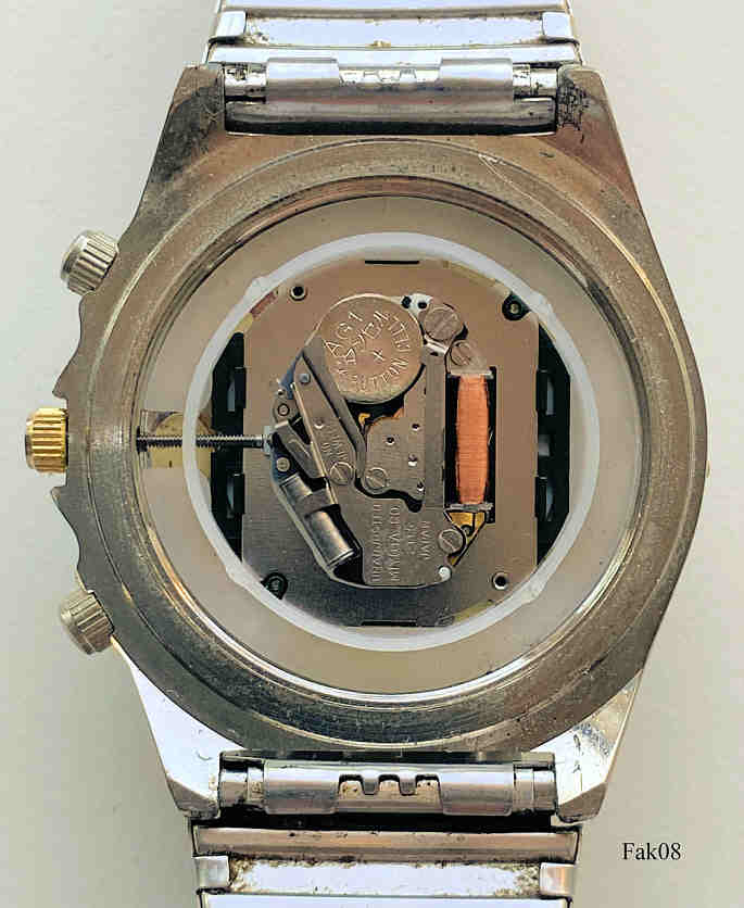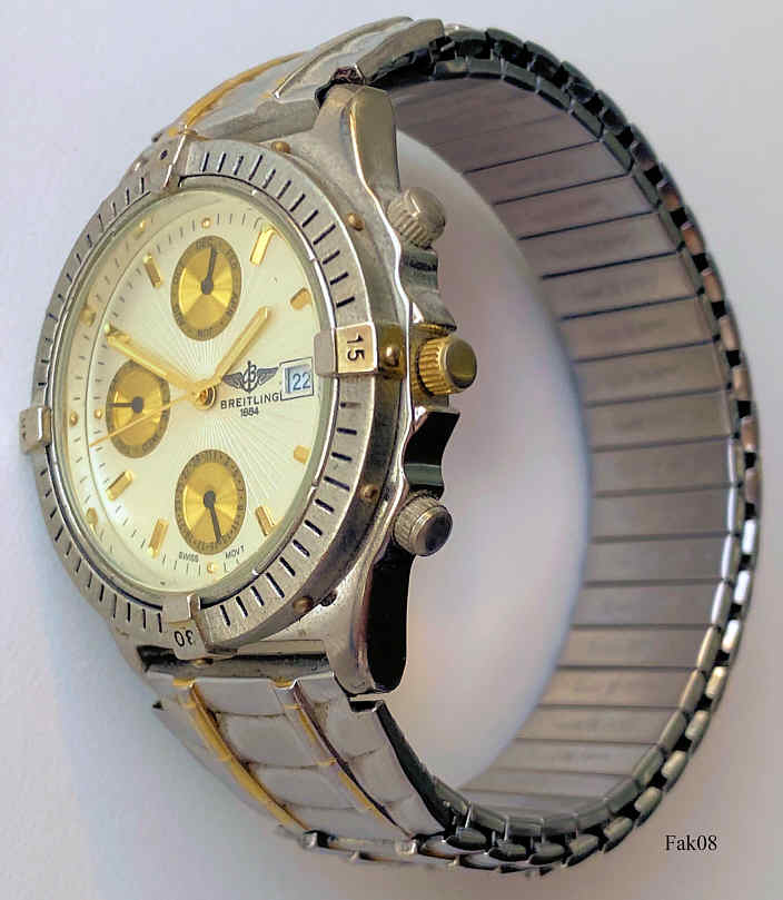 Dies ist eine nachgemachte Breitling, wie es sie im Original wohl nicht gibt. Die drei Chronos zeigen oben den Monat, Mitte den Wochentag und unten das Datum. Beschriftet vorn: “Breitling 1884, Swiss Movmt”, innen: “Unadjusted, Miyota Co, 2115, Japan, No Jewels”, hinten: “3 ATM Water Resistant, Goldtime, 24K Gold Plated, Hardness Crystal, Swiss Quartz, 10 MIC”. Die Rückwand gehört zu einer anderen Uhr. Sehr schönes Speidel Band