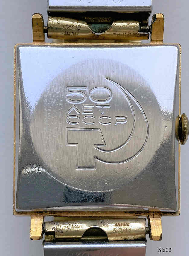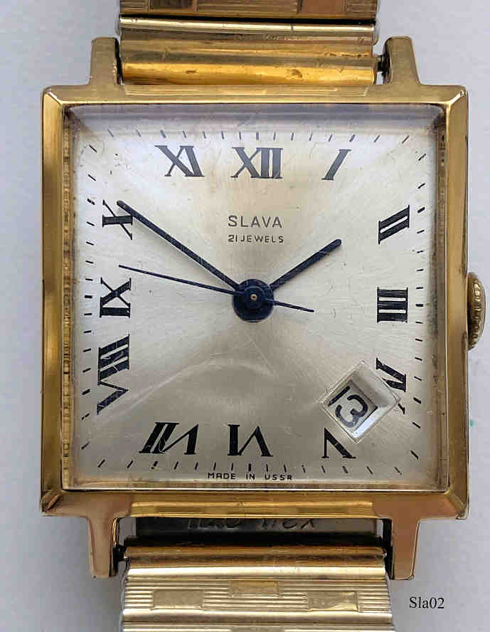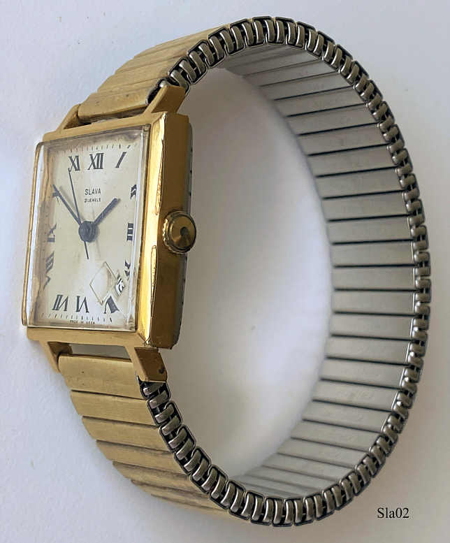 A russian Slava men’s watch with gold plated case and Stainless Steel back, brushed dial with roman numbers, 21 Jewel, nicely built, Calendar between 4 and 5, Flex band. Signed front: ”SLAVA, 21 Jewels, Made in USSR”, back: ”50 Years UDSSR” in russian, inside: “Twenty One, 21, Jewels, Logo, 274361”.This movement has two mainsprings and therefor a very long working time. Caliber Slava 2414