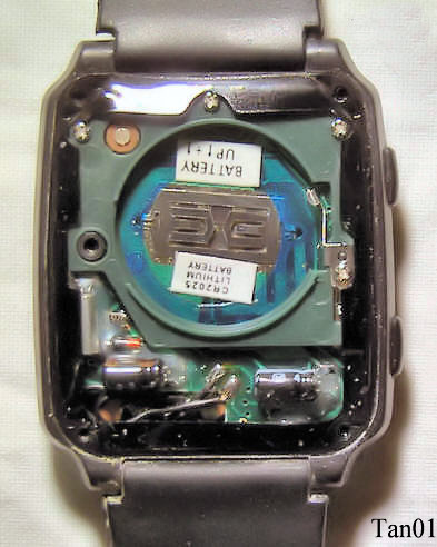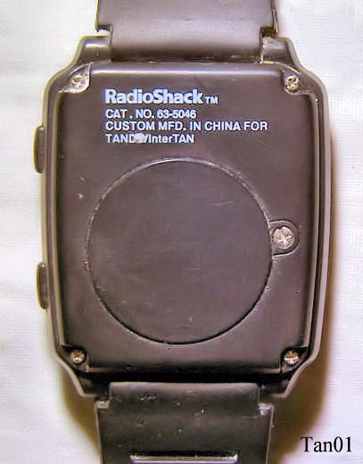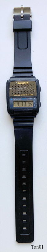 Eine sprechende Armbanduhr aus China, vertrieben über Radio Shack in USA. Beim Drücken auf den unteren “Talking” Knopf sagt die Uhr in englisch die Zeit an. Beschriftet vorn: ”Radio Shack, Talking Chrono Alarm”, hinten: ”Radio Shack TM, Cat. No. 63-5046, Custom MFD in China for Tandy / InterTAN”