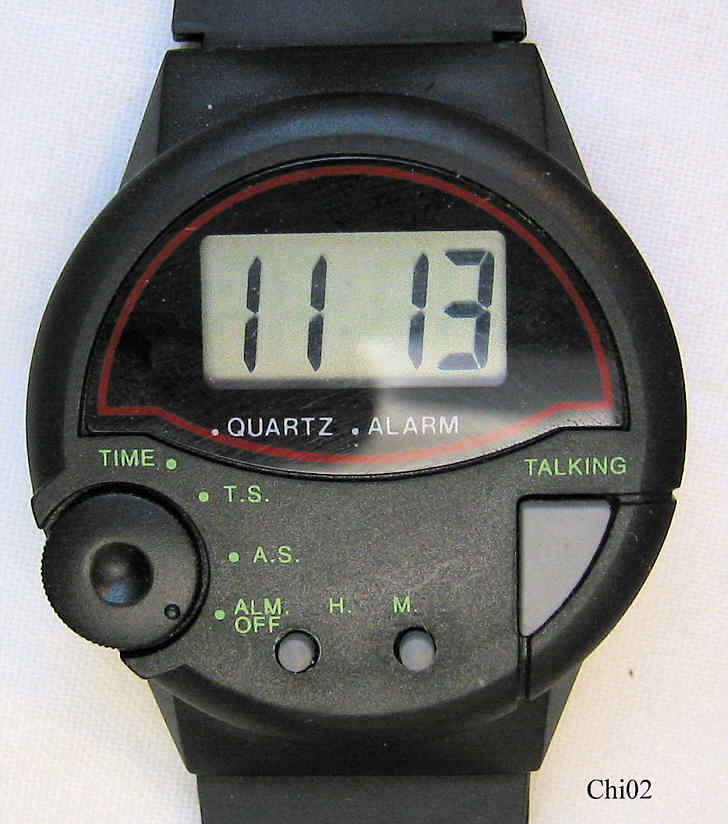 Eine sprechende Armbanduhr aus China. Beim Drücken auf den rechten “Talking” Knopf sagt die Uhr in deutsch die Zeit an. Der linke Knopf stellt den Modus ein: Zeitanzeige, Zeit Stellen, Alarm stellen, Alarm aus. Die beiden Stellknöpfe sind für Stunden und Minuten Einstellung. Kunststoff Gehäuse mit Kunststoff Armband.