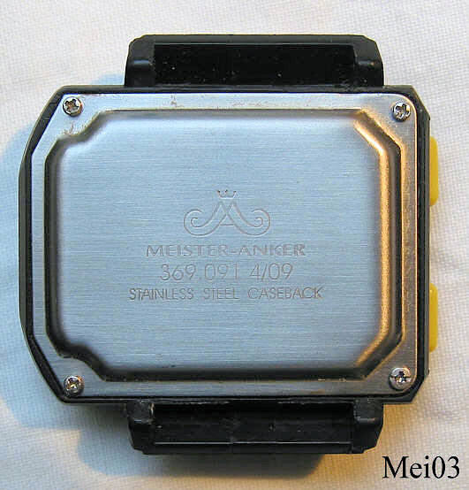 A Digital watch of Meister Anker with integrated World Time and Thermometer Function. Following Functions are available: Time / Day / Date (Foto), World Time for 23 capitals with Hi/ Lo Temparature, Alarm, Stopwatch. Signed front: ”World Time, Thermo Sensor, 23 Cities HI / LO Temp”, back: ”Meister Anker, 369091 4/09, Stainless Steel Caseback”, inside: “F0067”. LCD display with worldmap and timezone indication, Thermo Sensor, plastic case. |
