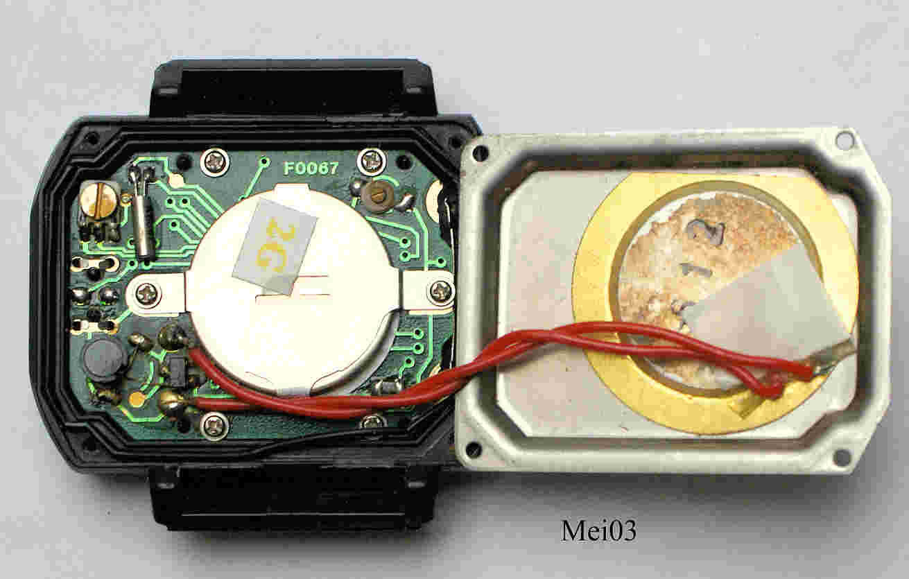Eine Digitaluhr von Meister Anker mit integrierter World Time und Thermometer Funktion. Folgende Funktionen sind eingebaut: Uhrzeit / Wochentag / Datum (Foto), World Time für 23 Städte mit Hi/ Lo Temparatur, Alarm, Stoppuhr. Beschriftet vorn: ”World Time, Thermo Sensor, 23 Cities HI / LO Temp” , hinten: ”Meister Anker, 369091 4/09, Stainless Steel Caseback”, innen: “F0067”. LCD Anzeige mit Weltkarte und Zeitzonen Anzeige, Thermo Sensor, Kunststoff Gehäuse. |