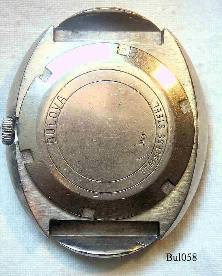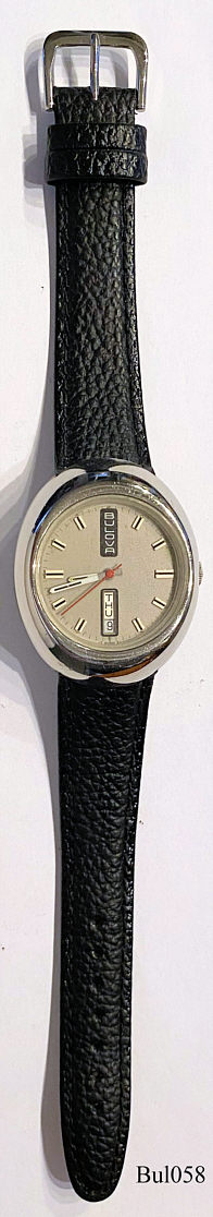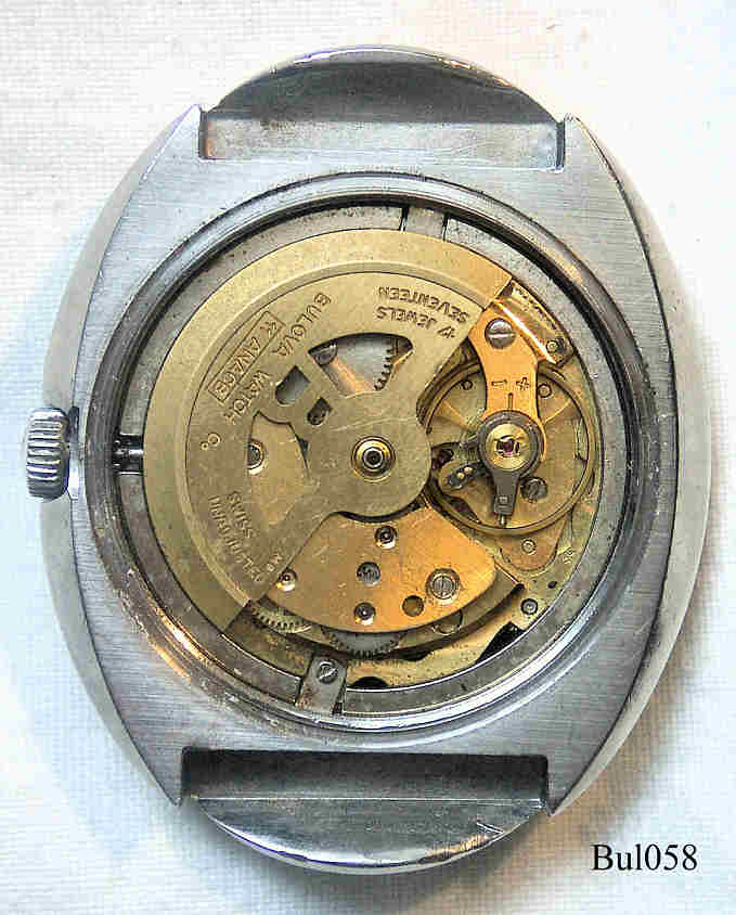 Eine Bulova Automatic Uhr in Edelstahl Gehäuse, 17 Jewels, Beschriftet vorn: ”BULOVA ”, Innen: ”17 Seventeen Jewels, M9, Swiss, Unadjusted, Bulova Watch Co., 11ANACB”, hinten: ”Bulova, Stainless Steel, N0”. Caliber 11ANACB, Day Date bei der 6. Die Uhr ist aus 1970 (N0), der Rotor ist ausgewechselt worden , daher die falsche Angabe M9.