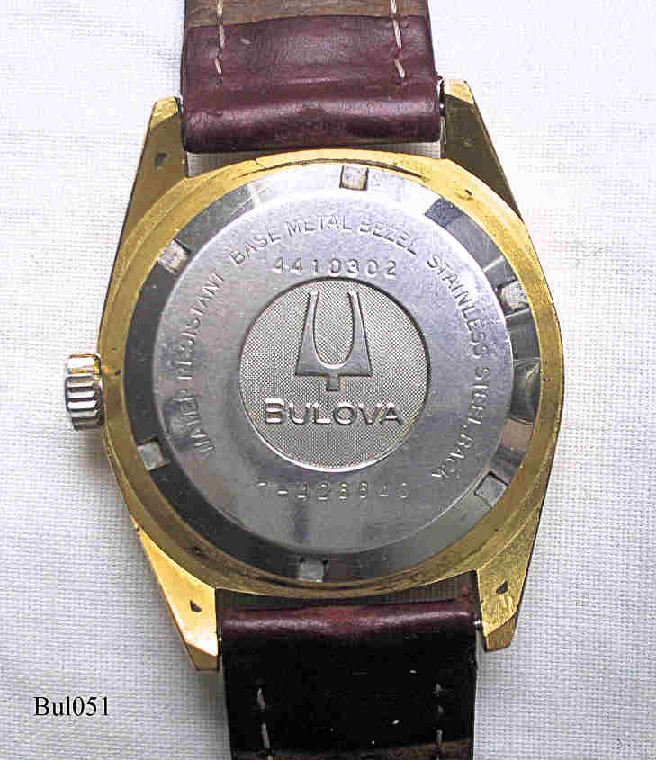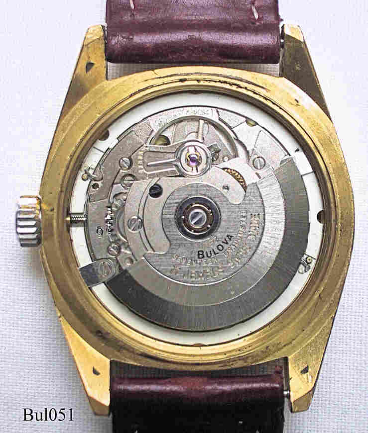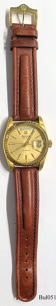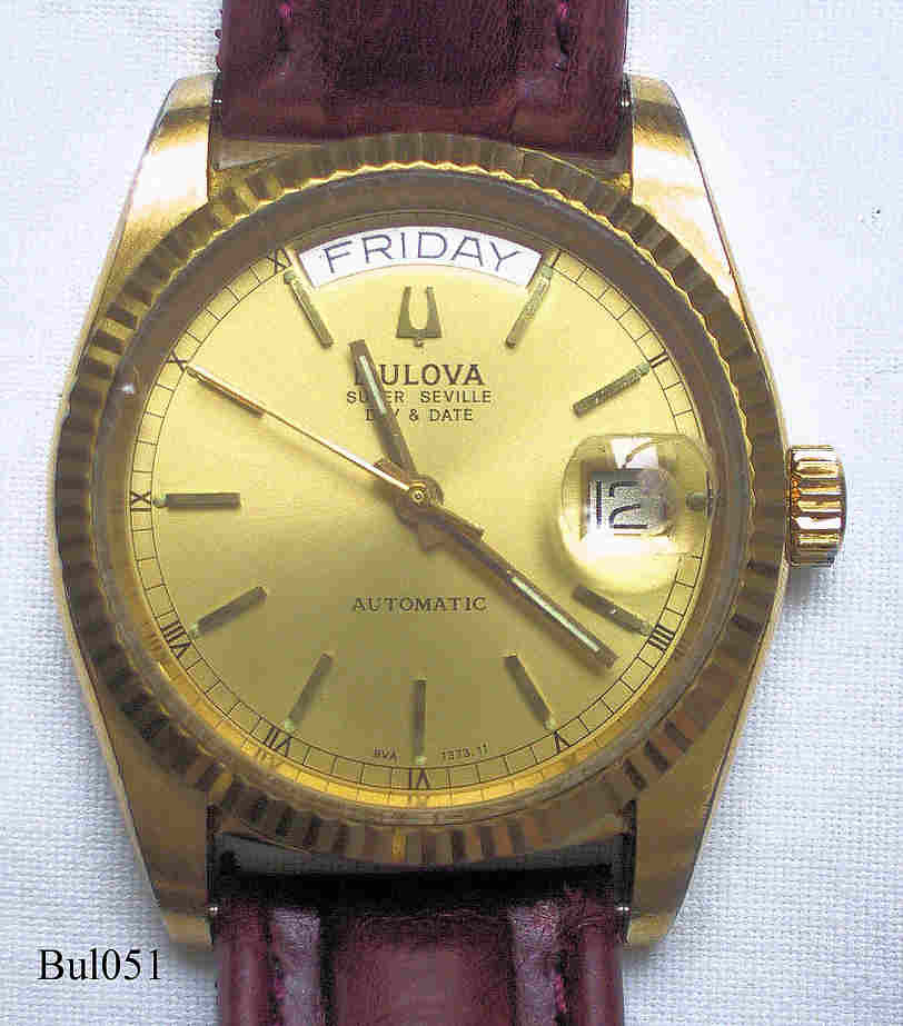 Eine sehr schöne automatic Uhr, ähnlich der Rolex Day Date, Beschriftet vorn: “Bulova, Super Seville, Day & Date, Automatic”, hinten: ”4410302, 7-426640, Bulova, Water Resistant, Base Metal Bezel, Stainless Steel Back”, innen: “Bulova, 17 Jewels, Swiss Made”, Caliber ETA 2834-2, Herstelldatum 1997 (P7), verschraubte Krone, Tagesanzeige zwische 11 und 1, Datum bei 3 mit Vergrößerungslinse im Glas, Weinrotes Lederarmband mit Bulova Schließe.