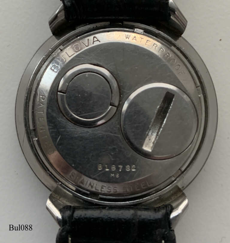 Bulova 214 Astronaut with a simple black dial, signed front: ”Bulova, Accutron, Astronaut”, back: “BULOVA, Patented, Stainless Steel, Waterproof, B18732, M6”, inside: “Bulova, 214 HN, USA, Pat.:2.971.323, M6”, Caliber 214HN, Manufacturing date 1966 (M6), screw-on case back, clip lever on the back to adjust the time. The Astronaut has an additional hand to show the 24 hours time or an extra timezone, today it would be called GMT display. Also there is a turnable 24 hours ring around the dial.