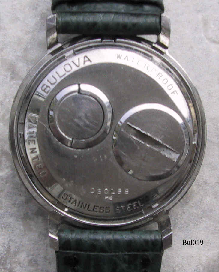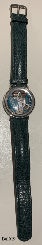 Eine umgebaute Bulova Spaceview mit Edelstahlgehäuse, Beschriftet hinten: “Waterproof, Patented, Stainless Steel, BULOVA, D30188, M5”, innen: “Bulova, 214, USA, Pat.:2.971.323, M5”, Caliber 2140, Herstelldatum 1965 (M5), verschraubter Boden, Einstellung über Stellring an der Rückseite. Die Zeiger waren Edelstahl, habe ich selbst weiß angestrichen, also nicht original. Grünes Lederarmband nicht original.
