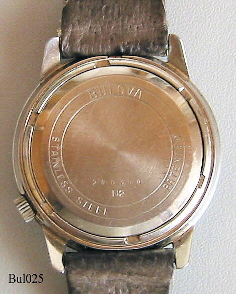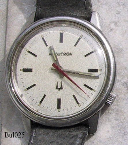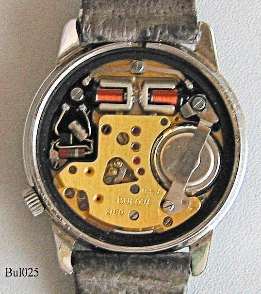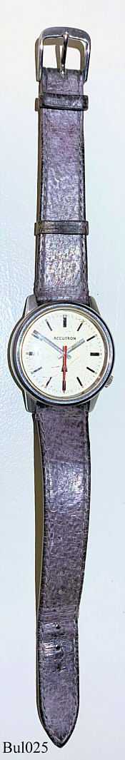 Eine Bulova Accutron mit Edelstahlgehäuse, Beschriftet vorn: ”Accutron”, hinten: “BULOVA, Stainless Steel, Patented, 240304, N2”, innen: “USA, BULOVA, 2180”, Caliber 2180, Herstelldatum 1972 (N2), Krone bei der 4, verschraubter Boden, graues Leder Armband. Case # 952