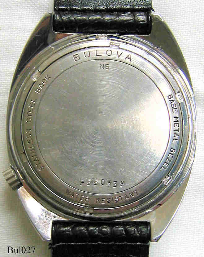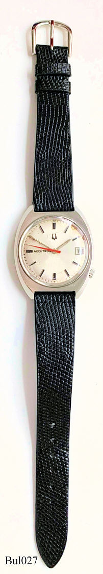 Eine Bulova Accutron mit Edelstahlgehäuse, Beschriftet vorn: “Accutron”, hinten: ”BULOVA, Stainless Steel Back, Base Metal Bezel, Water Resistant, F 550339”, innen: “USA, BULOVA, 2181”, Caliber 2181, Herstelldatum 1976 (N6), Case # G3660, verschraubter Boden, Datum in Silber bei der 3, Krone bei der 4.