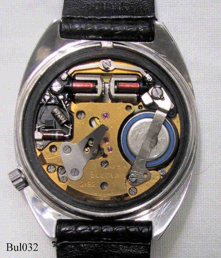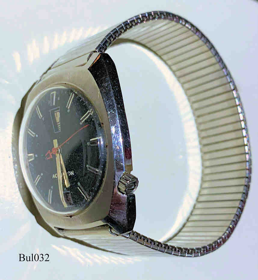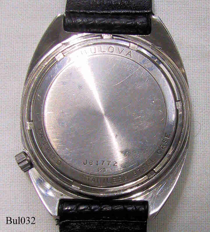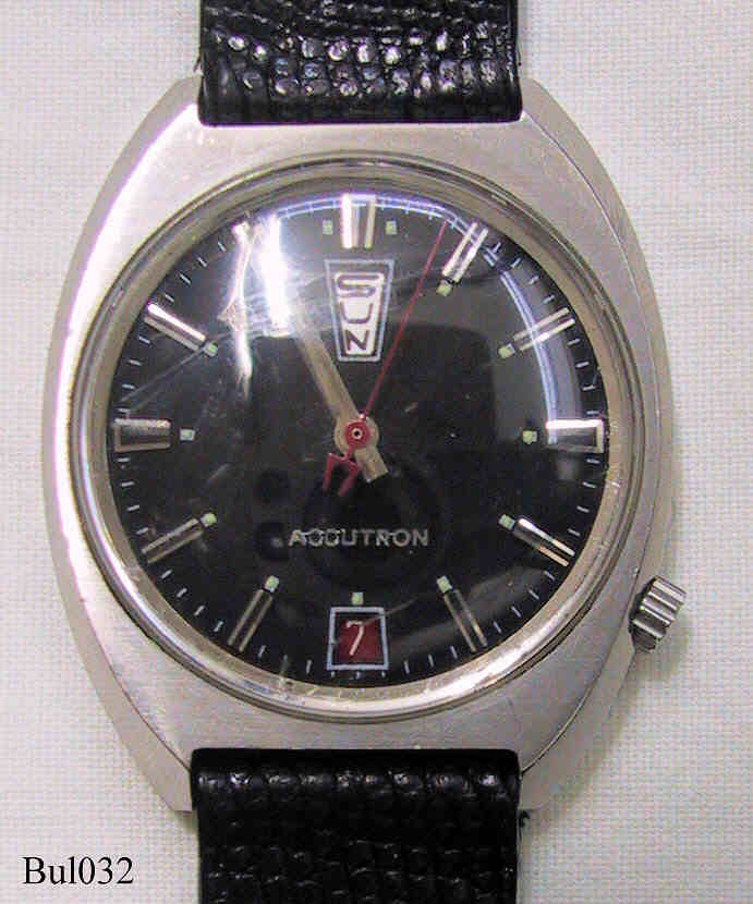 Eine Bulova Accutron mit Edelstahlgehäuse und besonderer Anordnung der Day/Date Anzeigen, deshalb auch genannt Over/Under. Beschriftet vorn: “Accutron”, hinten: “Bulova, patented, Stainless Steel Case, J61772, M9”, innen: “USA, Bulova, 2182”, Case #2975, Caliber 2182, Herstelldatum 1969 (M9), verschraubter Boden, Krone bei der 4, Day in weiß bei der 12, Date in Rot bei der 6, schwarzes Zifferblatt, Sekundenzeiger mit dem Stimmgabelsymbol, schwarzes Accutron Eidechs-Armband.