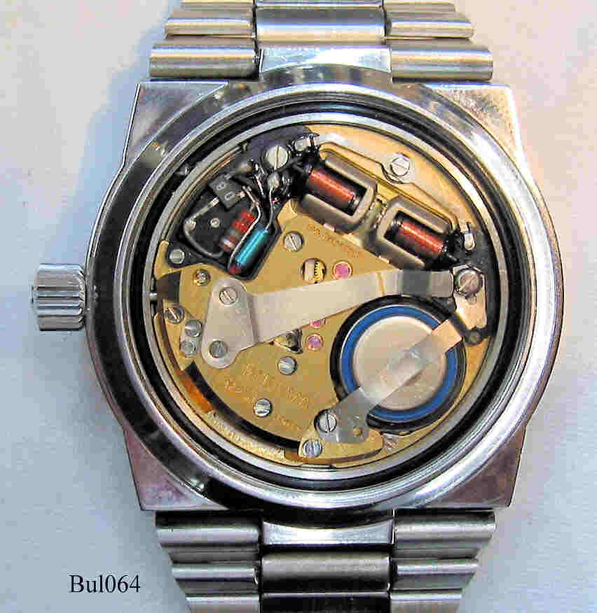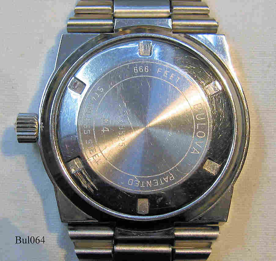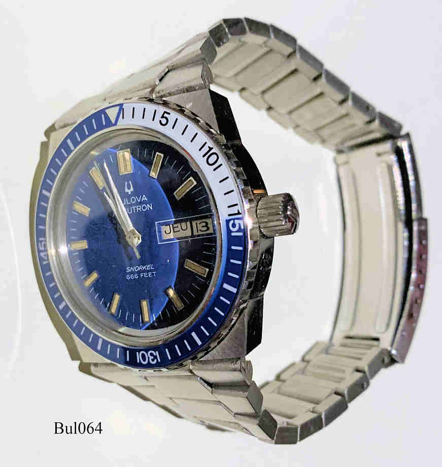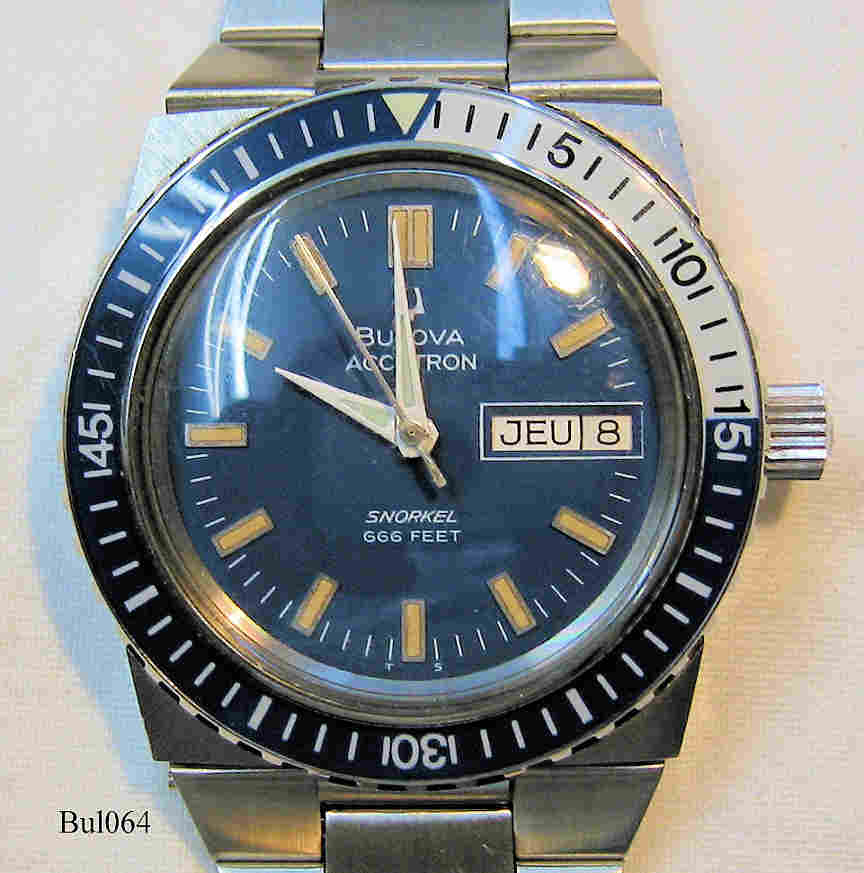 Bulova Accutron Snorkel divers watch with stainless steel case and day/date window. Signed front: “Bulova, Accutron, Snorkel, 666 Feet”, back: ”Bulova, Patented, Stainless Steel, 666 Feet, 3-646525, N4”, inside: “BULOVA, 2182, Swiss”, Case # 7526-1, Serialnumber 3-646525, Caliber 2182G, screw-down crown at 3, day/date in white at 3, blue dial, blue chapter ring, manufacturing date 1974 (N4), Stainless Steel band. The Caliber 2182G has, as the 2182F, an additional contact cutting the elctrical current when the crown is pulled. The equivalent ladies watch is here.