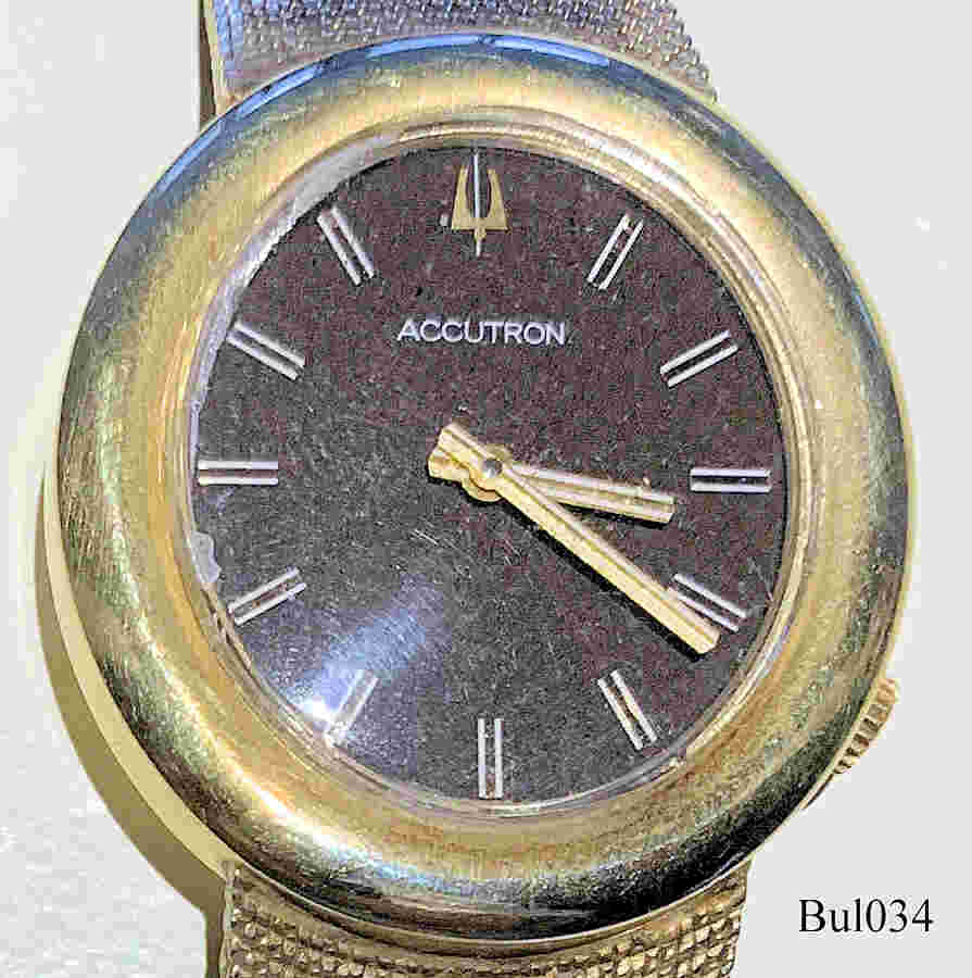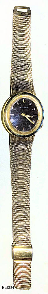 Eine Bulova Accutron mit ovalem 14 K vergoldetem Gehäuse ohne Zentralsekunde, braunes Zifferblatt, Beschriftet vorn: “Accutron”, hinten:  “J 1/10 14K gold filled, BULOVA, 53225, N1”,innen: “U.S.A., Bulova, 2183”. Case # L 160,  Caliber 2183, Herstelldatum 1971 (N1), integriertes, vergoldetes Gliederarmband.