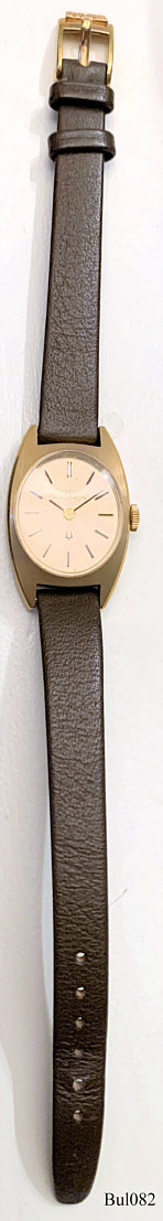 Bulova Ladies Accutron with Stainless Steel Case, signed front: “Bulova, Accutron”, back: “2-776307”, inside: “Bulova, USA, 2210, N3”, Caliber 2210, date of production 1973 (N3), dark brown leather strap.