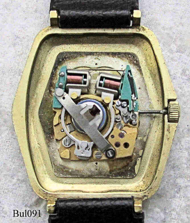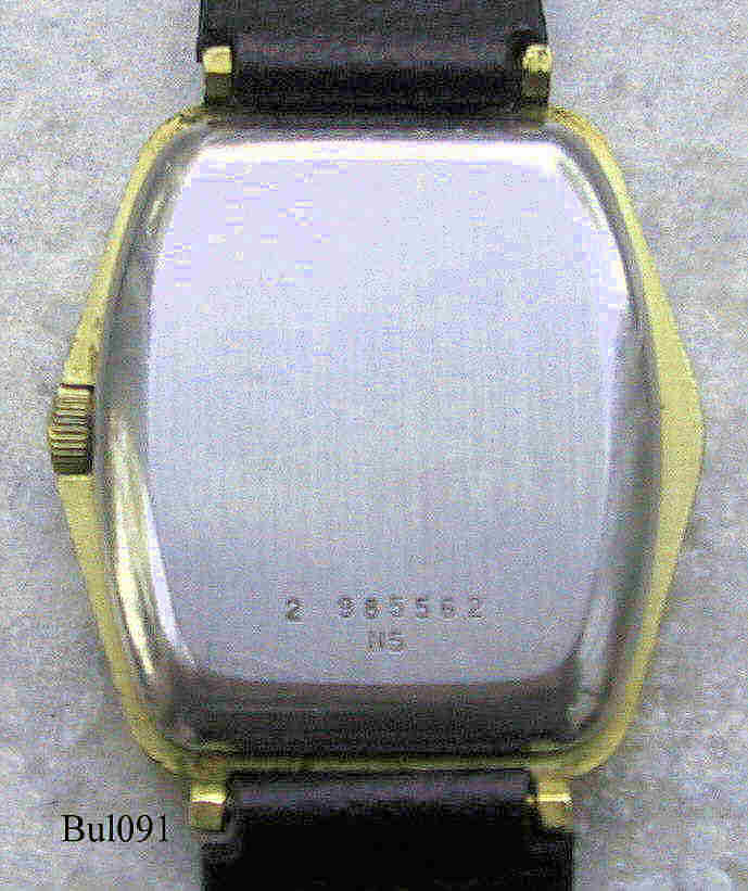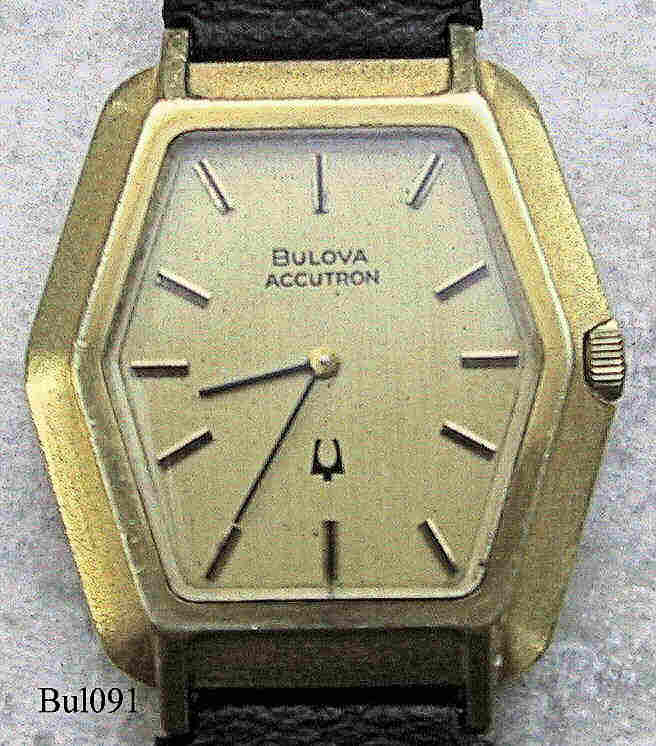 Bulova Mans Accutron 221 with goldtone case, signed front: “Bulova, Accutron”, back: “2 985562, N5”, inside: “Caliber 2210”, Caliber 2210, date of production 1975 (N5), clip-on back, black leather strap.