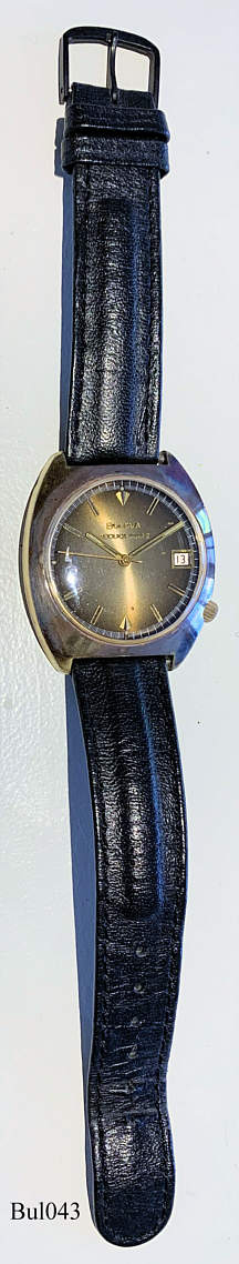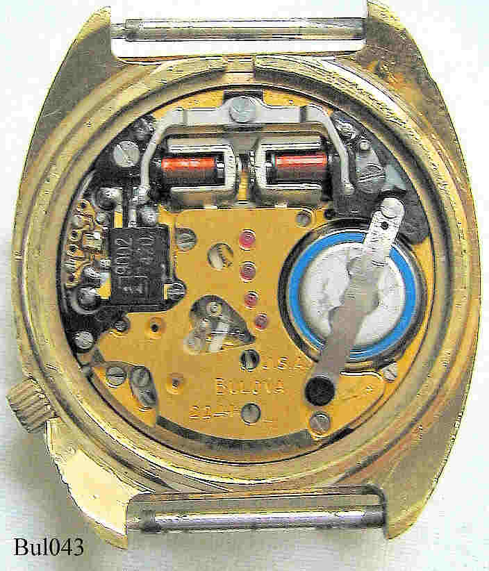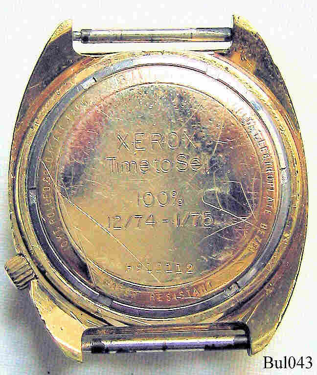 Eine Bulova Accuquartz Herren Uhr mit 10K vergoldetem Gehäuse, Beschriftet vorn: “Bulova, Accuquartz”, hinten: “Bulova, Gold Electroplated Bezel, 10K Rolled Gold Plate Back, H912112, N4”, Zusatzinschrift:”XEROX, Time to Sell, 100%, 12/74 - 1/75”, innen: “USA, Bulova, 2241”, .Caliber 2241, Herstelldatum 1974 (N4), Date bei der 3, Krone bei der 4. Diese Uhr ist die letzte aus der Reihe der Stimmgabeluhren, hier wird die Stimmgabel nur noch zum Antrieb der Zeiger benutzt, die Schwingfrequenz wird durch einen Quartz erzeugt. Sichtbares Zeichen dafür ist der Zirkon bei der 9.