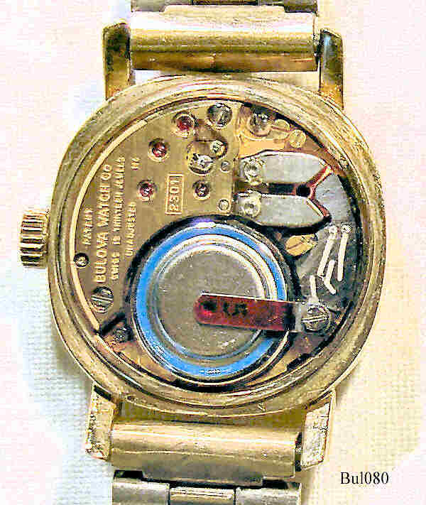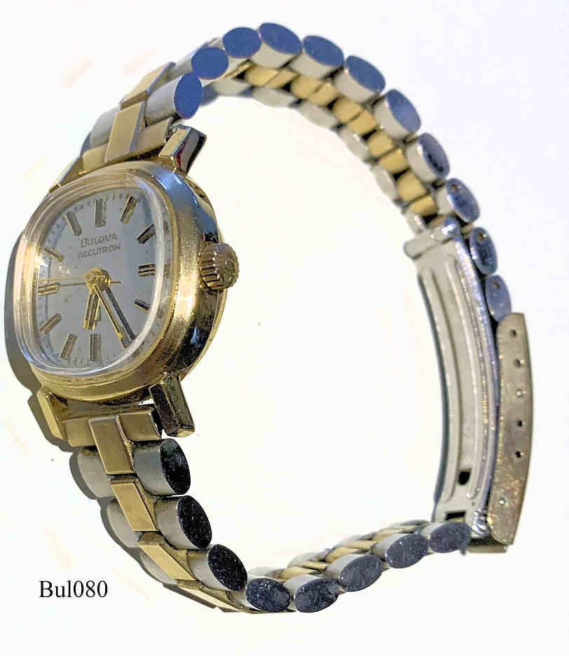 Bulova Accutron ladies watch with gold filled case and mirror dial, signed front: “Bulova, Accutron”, back: “Bulova, N4, G96755, 10K R.G.P. Back, Gold Electroplated Bezel, N4”, inside: “Patent, BulovaWatch Co., Swiss 13 Thirteen Jewels, Unadjusted N4, 2301”, Caliber 2301, date of manufacture 1974 (N4), 10K gold filled Baldwin metal band.