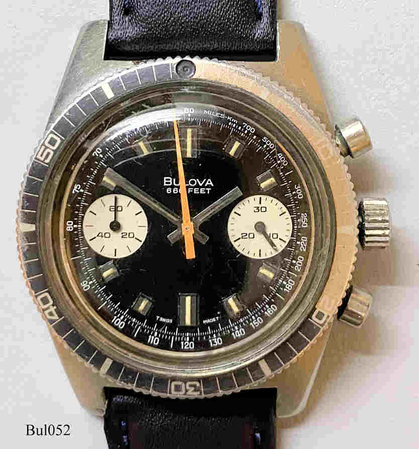 A Bulova Handwind “Deep Sea” Chronograph with stainless steel case, black dial and chapter ring, signed front: “Bulova, 666 Feet, Swiss Made”, inside: ”Bulova Watch Co., 14EB, N3, seventeen (17) Jewels, unadjusted”, Caliber 14EB, date of production 1973 (N3), selfmade glass back. The movement is a Valjoux 7733. Saved from scrap box and repaired by my Luxembourg friend Jos Freylinger.