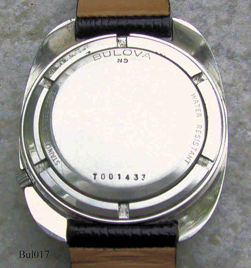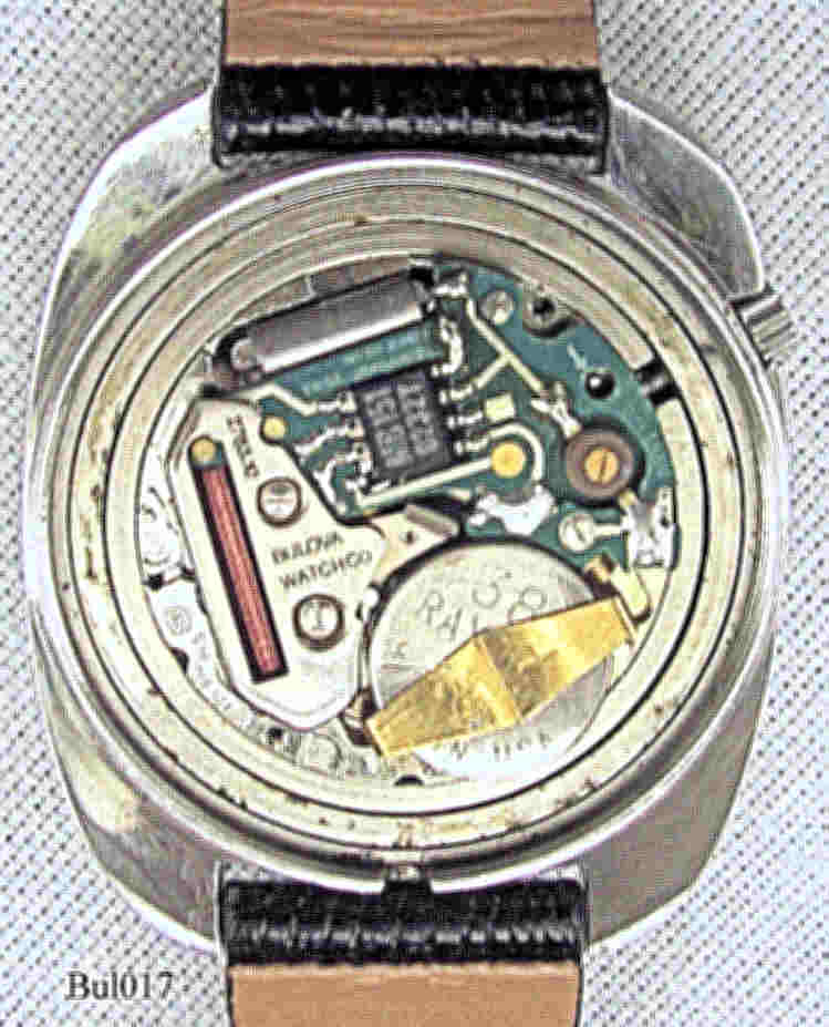 Eine Accuquartz von Bulova mit dem für die Accuquartz typischen “Brillianten” und dem Quartz Symbol auf dem Zifferblatt, Beschriftet vorn: ”Bulova, Accuquartz”, hinten: ”Bulova, Stainless Steel Case, Water Resistant, N9, T001433”, innen: “Bulova Watch Co., 2783.10”, Herstelldatum 1979 (N9), Caliber 2783.10, Tag und Datum bei 3. Caravelle Eidechs-Lederarmband mit neutraler Schließe.