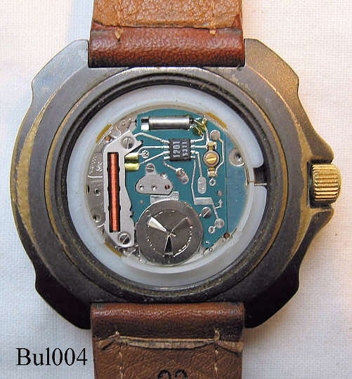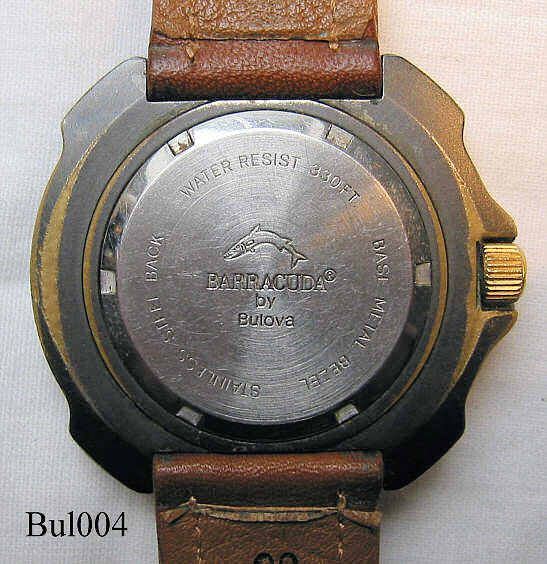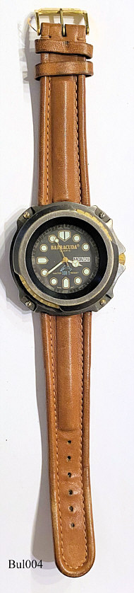 Eine Barracuda Taucheruhr von Bulova. Beschriftet vorn: ”Barracuda, Quartz,Water Resist, 330 ft, Swiss Movt.”, hinten :”Barracuda by Bulova, Stainless Steel Back, Water Resist 330 ft, Base Metal Bezel”, Tag und Datum bei 3, braunes Lederarmband mit neutraler Schließe, schweres Bronzegehäuse mit verdecktem Messing Stellring. Werk ETA 555.425