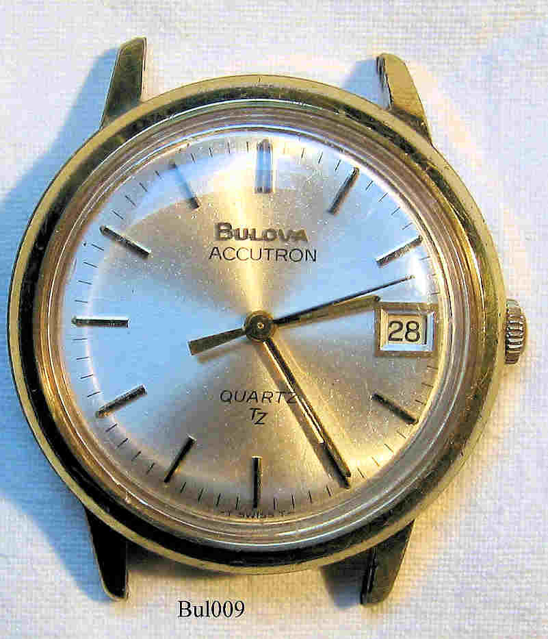 Eine Bulova Accutron Quartz TZ , Beschriftet vorne: ”Accutron, Quartz, TZ”, hinten: “BULOVA, Water resistant,Base Metal Bezel, N8”, innen: ”N7, 2426.10, Swiss, unadjusted, No - 0 - Jewels, Bulova, Swiss”, Kaliber 2426.10, Herstelldatum 1977 (N7).