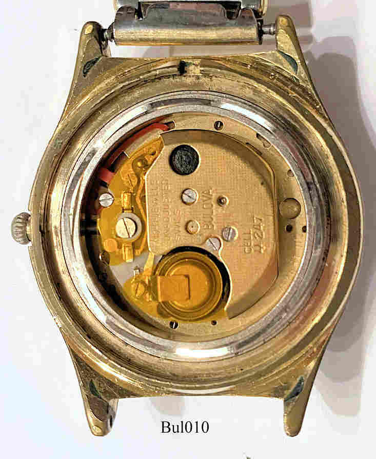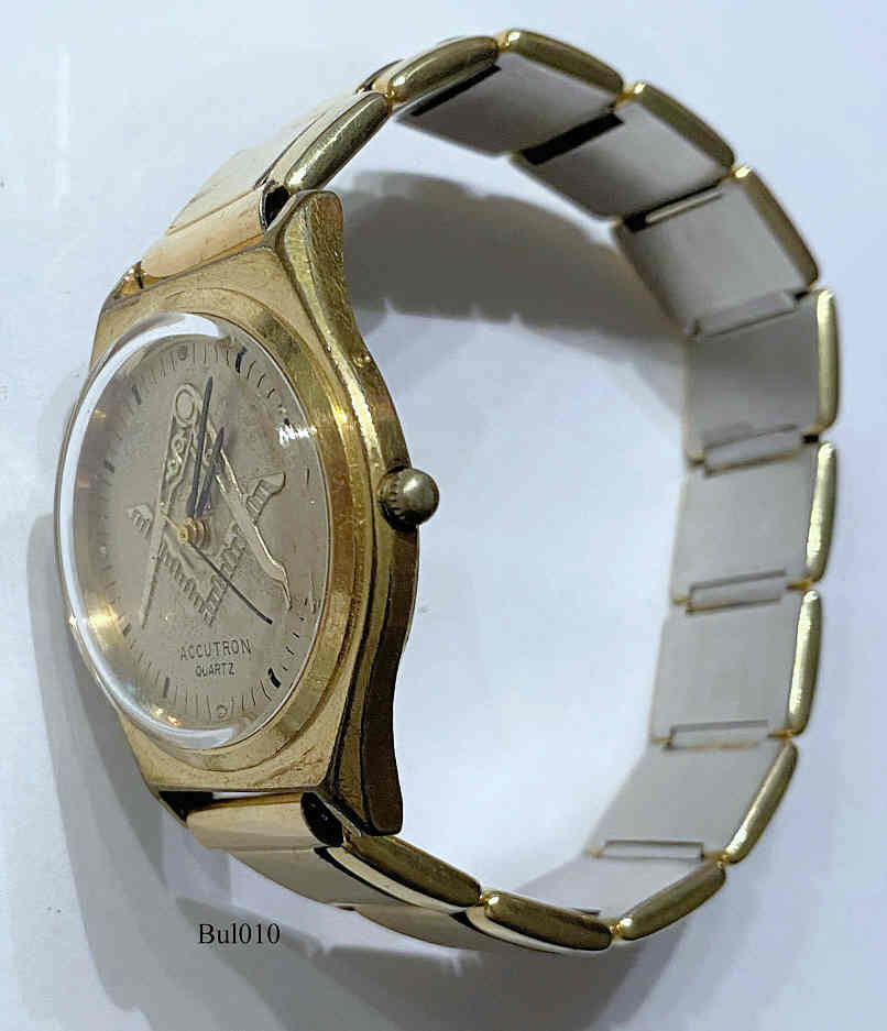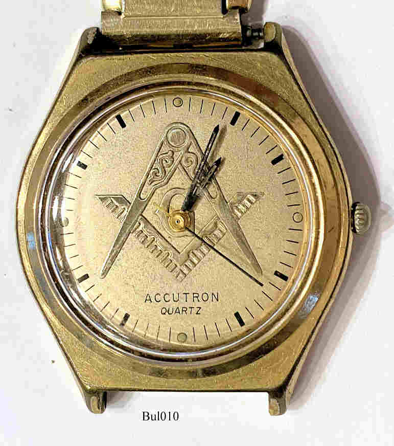 Bulova Accutron Quartz with a Masonic dial, Signed front: ”Accutron, Quartz”, back: “BULOVA, Water resistant,10 Kt. R.G.R Back, N9, Base Metal Bezel”, inside: ”No - 0 - Jewels, unadjusted, Swiss, BULOVA, Cell 247”, Caliber 2451.10, date of production 1979 (N9).