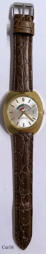 Dies ist eine Certina Biostar Electronic, die einzige elektromechanische Uhr mit Anzeige der Biorhythmus Kurven des Eigentümers. Im Kalenderfenster bei der drei wird der Wochentag als Ziffer angezeigt (Montag ist 1....). Die Uhr muß beim Kauf auf das Geburtsdatum des Käufers eingestellt werden und zeigt dann jeweils den Stand der drei Biorhythmus Kurven auf den Skalen bei der 12 an. Der farbige Teil zeigt die positive Kurve, der silberne Teil die negative Kurve. Werk N° 9074081, Caliber 28-353, ESA 9154. Beschriftet vorn: ”Certina, Biostar Electronic, Swiss LIC ATO”, innen: ”Certina, 28-353, unadjusted”, hinten: ”7506 001, 9074081”. Vorgänger dieser Uhr war die Biostar.