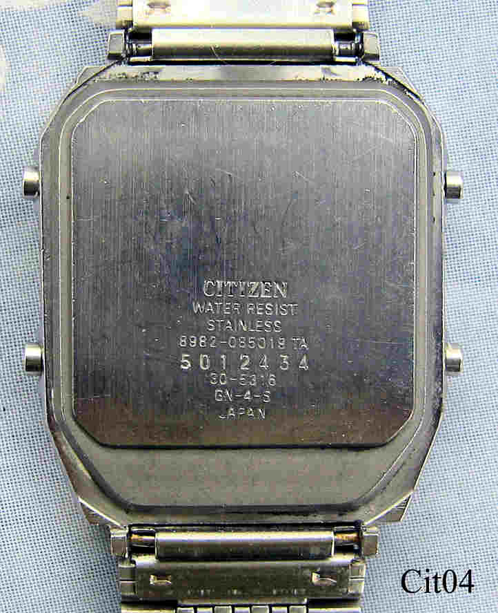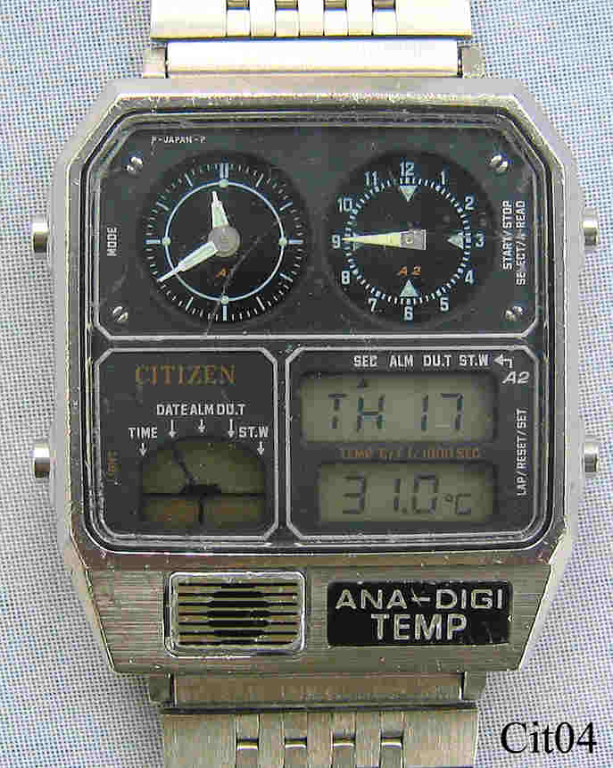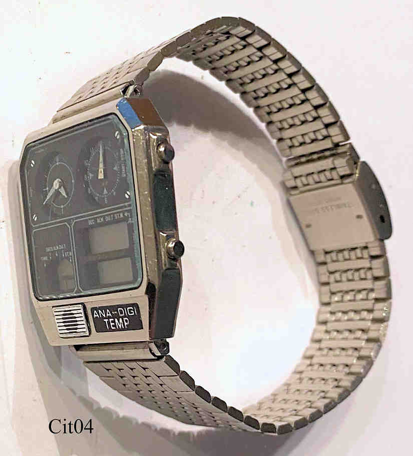 Ein Citizen Chronograph mit Edelstahl Gehäuse und Stainless Steel Back. Kaliber Citizen 8982, ein Analog Zifferblatt, ein Analog Stoppuhr Zifferblatt, zwei LCD Digitalanzeigen, eine LCD Funktionsanzeige. Beschriftung vorn: “Citizen Ana-Digi-Temp”, hinten: ”Citizen, Water Resist, Stainless, 8982-085019 TA,5012434, 30-5316, GN-4-S, Japan”, innen: “Four 4 Jewels, Citizen Watch Co., Unajusted, Japan, 8982”. Citizen Edelstahl Armband mit Citizen Schließe. Funktionen sind: Zeit, Kalender, Alarm, Dual Time, Stoppuhr, Chime, Thermometer. Dies war die erste Armbanduhr weltweit, die die Temperatur anzeigen konnte.