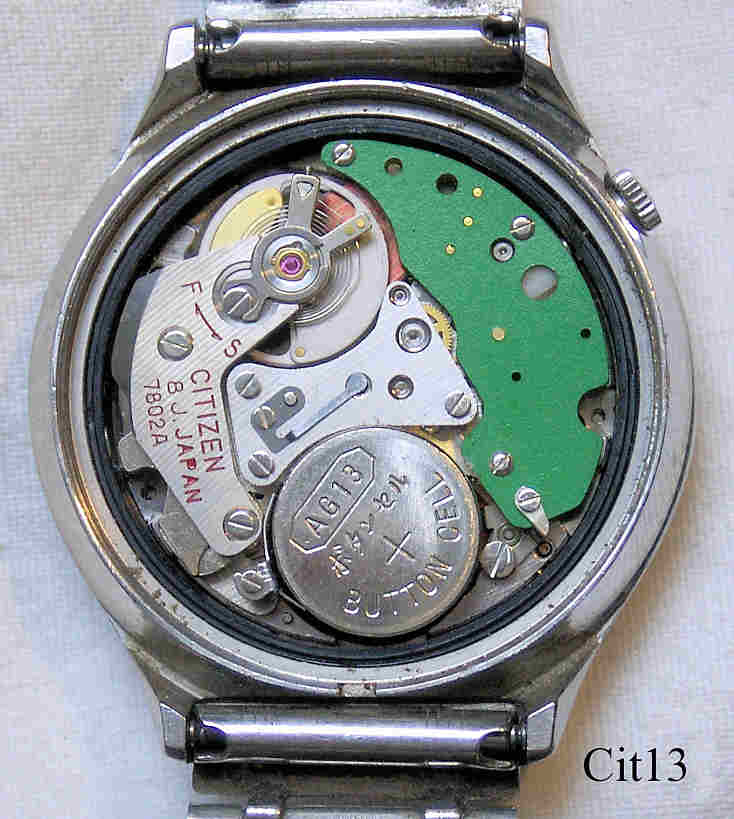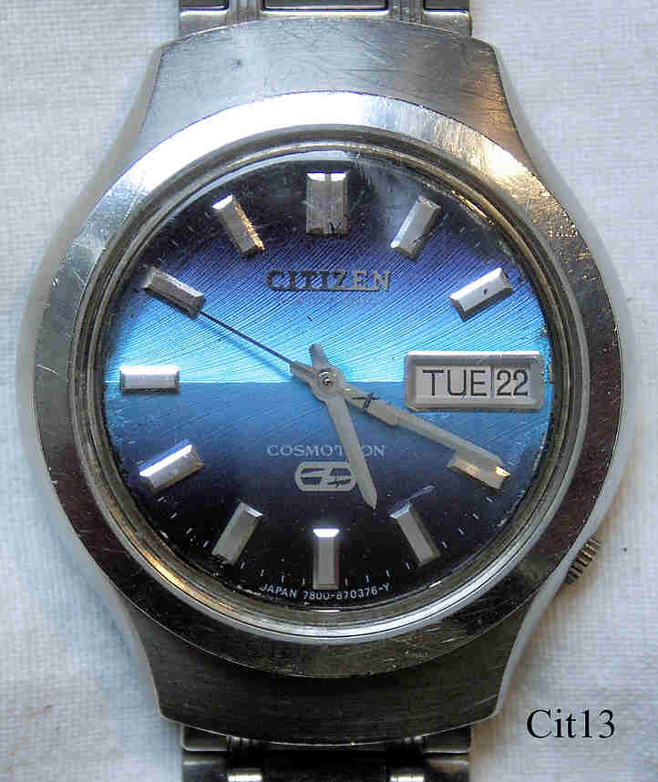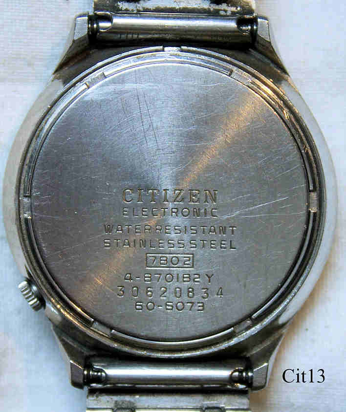 Dies ist eine Citizen Cosmotron Armbanduhr in Edelstahl, Citizen Caliber 7802A, Referenz Nr.: 4-870182Y, Beschriftet vorn: ”CITIZEN, Electronic, Cosmotron, Japan 7800-870376-Y”, Rückseite: ”Citizen, Electronic, Waterresistant, Stainless Steel, 7802, 4-870182Y, 30620834, 60-6073”, innen: “Citizen, 8J, Japan, 7802A”, Edelstahlgehäuse, Edelstahlband mit CITIZEN Schließe. Interessant ist die Datumsverstellung: Senkrecht gehalten kann man durch Druck auf die Krone das Datum verstellen, über Kopf gehalten verstellt man durch Druck auf die Krone den Wochentag.